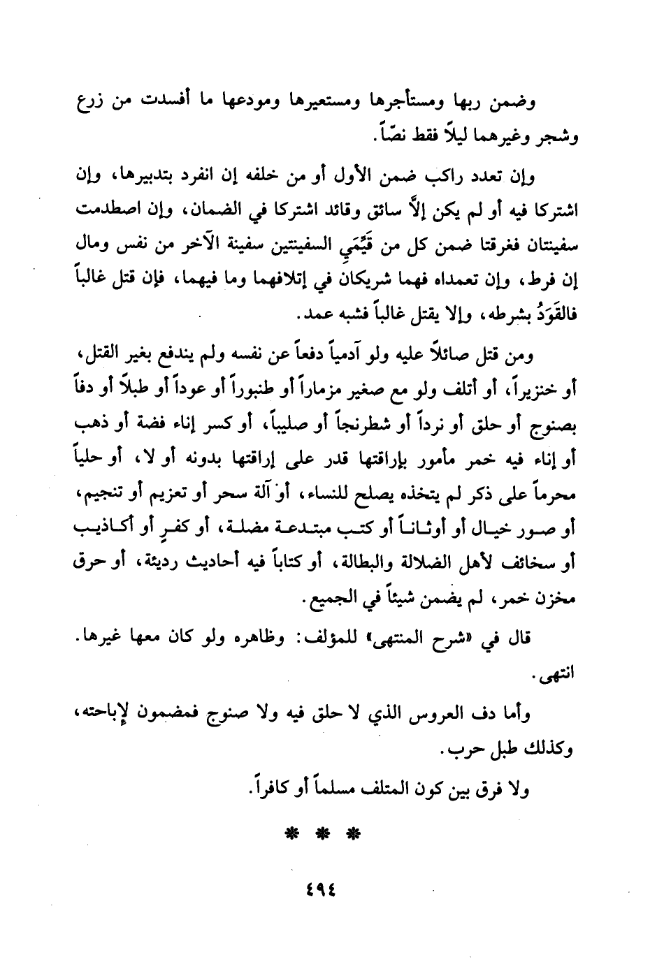 وَضمن رَبهَا ومستأجرها ومستعيرها ومودعها مَا أفسدت من زرع وَشَجر وَغَيرهمَا لَيْلًا فَقَط نصا. وَإِن تعدد رَاكب ضمن الأول أَو من خَلفه إِن انْفَرد بتدبيرها، وَإِن اشْتَركَا فِيهِ أَو لم يكن إِلَّا سائق وقائد اشْتَركَا فِي الضَّمَان. وَإِن اصطدمت سفينتان فغرقتا ضمن كل من قيمى السفينتين سفينة الآخر وَمَا فِيهَا من نفس وَمَال إِن فرط، وَإِن تعمداه فهما شريكان فِي إتلافهما وَمَا فيهمَا، فَإِن قتل غَالِبا فالقود بِشَرْطِهِ، وَإِن لَا يقتل غاليا فَشبه عمد. وَمن قتل صائلا عَلَيْهِ وَلَو آدَمِيًّا دفعا عَن نَفسه وَلم ينْدَفع بِغَيْر الْقَتْل، أَو خنزيرا، أَو أتلف وَلَو مَعَ صَغِير مِزْمَارًا أَو طنبورا أَو عودا أَو طبلا أَو دفا بصنوج أَو حلق أَو نردا أَو شطرنجا أَو صليبا أَو كسر إِنَاء فضَّة أَو ذهب أَو إِنَاء فِيهِ خمر مَأْمُور بإراقتها قدر على إراقتها بِدُونِهِ أَو لَا حليا محرما على ذكر لم يَتَّخِذهُ يصلح للنِّسَاء أَو آله سحر أَو تعزيم أَو تنجيم أَو صور خيال أَو أوثانا أَو كتب مبتدعة مضلة أَو كفرا وأكاذيب أَو سخائف لأهل الضَّلَالَة والبطالة أَو كتابا فِيهِ أَحَادِيث رَدِيئَة أَو حرق مخزن خمر لم يضمن شَيْئا فِي الْجَمِيع. قَالَ فِي شرح الْمُنْتَهى للمؤلف: وَظَاهره وَلَو كَانَ مَعهَا غَيرهَا. وَأما دف الْعَرُوس الَّذِي لَا حلق فِيهِ وَلَا صنوج فمضمون لإباحته، وَكَذَلِكَ طبل حَرْب، وَلَا فرق بَين كَون الْمُتْلف مُسلما أَو كَافِرًا.