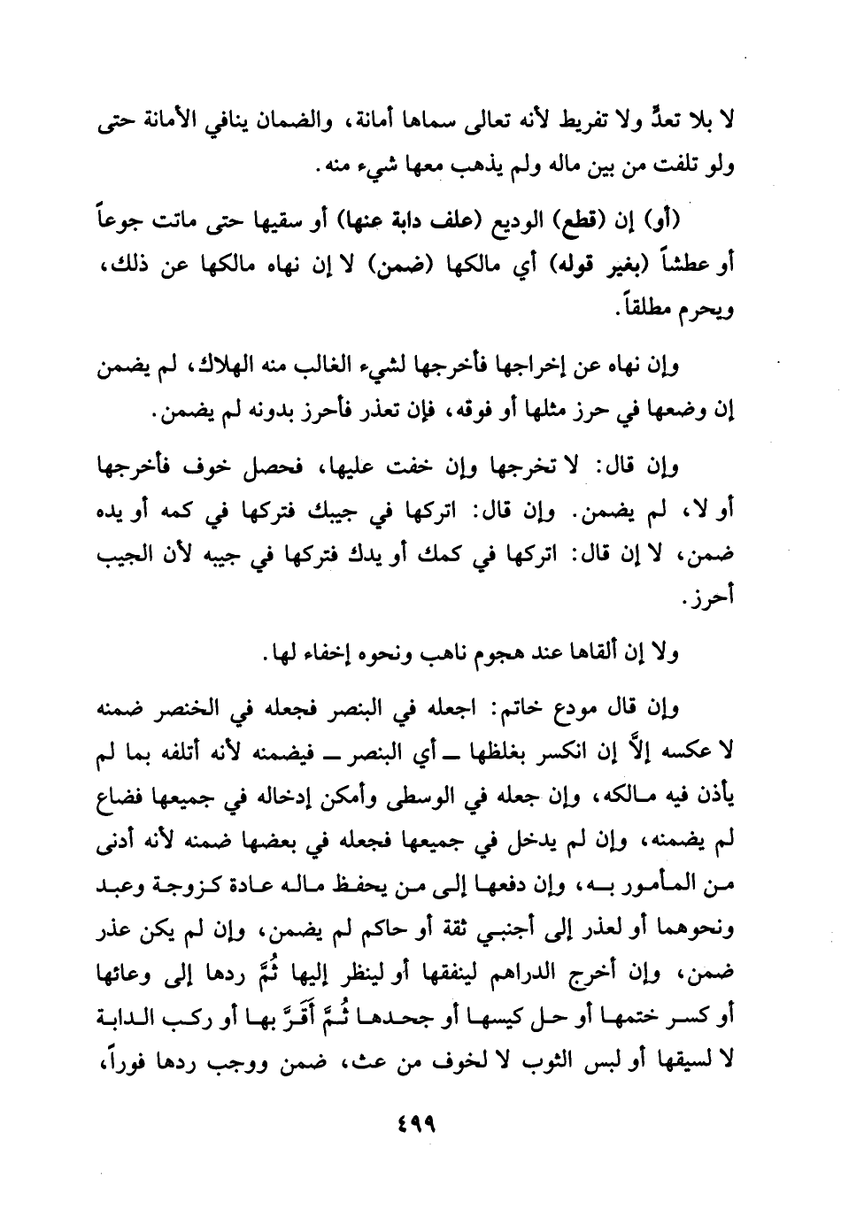 لَا بِلَا تعد وَلَا تَفْرِيط لِأَنَّهُ تَعَالَى سَمَّاهَا أَمَانَة، وَالضَّمان يُنَافِي الْأَمَانَة حَتَّى وَلَو تلفت من بَين مَاله وَلم يذهب مَعهَا شَيْء مِنْهُ [أَو] إِن [قطع] الْوَدِيع [علف دَابَّة عَنْهَا] أَو سقيها حَتَّى مَاتَت جوعا أَو عطشا بِغَيْر قَوْله مَالِكهَا ضمن لَا إِن نَهَاهُ مَالِكهَا عَن ذَلِك، وَيحرم مُطلقًا. وَإِن نَهَاهُ عَن إخْرَاجهَا فأخرجها لشَيْء الْغَالِب مِنْهُ الْهَلَاك لم يضمن إِن وَضعهَا فِي حرز مثلهَا أَو فَوْقه، فَإِن تعذر فأحرز بِدُونِهِ لم يضمن وَإِن قَالَ: لَا تخرجها وَإِن خفت عَلَيْهَا فَحصل خوف فأخرجها أَو لَا لم يضمن. وَإِن قَالَ اتركها فِي جيبك فَتَركهَا فِي كمه أَو يَده ضمن لَا إِن قَالَ: اتركها فِي كمك أَو يدك فَتَركهَا فِي جيبه لِأَن الجيب أحرز. وَلَا إِن أَلْقَاهَا عِنْد هجوم ناهب وَنَحْوه إخفاء لَهَا، وَإِن قَالَ مُودع خَاتم: اجْعَلْهُ فِي البنصر فَجعله فِي الْخِنْصر ضمن لَا عَكسه، إِلَّا إِن انْكَسَرَ لغلظها أَي البنصر فَيضمنهُ لِأَنَّهُ أتْلفه بِمَا لم يَأْذَن فِيهِ مَالِكه، وَإِن جعله فِي الْوُسْطَى وَأمكن إِدْخَاله فِي جَمِيعهَا فَضَاعَ لم يضمنهُ، وَإِن لم يدْخل فِي جَمِيعهَا فَجعله فِي بَعْضهَا لِأَنَّهُ أدنى من الْمَأْمُور بِهِ، وَإِن دَفعهَا إِلَى من يحفظ مَاله عَادَة كَزَوْجَة وَعبد وَنَحْوهمَا أَو لعذر إِلَى أَجْنَبِي ثِقَة أَو حَاكم لم يضمن وَإِن لم يكن عذر ضمن، وَإِن أخرج الدَّرَاهِم لينفقها أَو لينْظر إِلَيْهَا ثمَّ ردهَا إِلَى وعائها أَو كسر خَتمهَا أَو حل كيسها أَو جَحدهَا ثمَّ أقرّ بهَا، أَو ركب الدَّابَّة لَا ليسقيها أَو