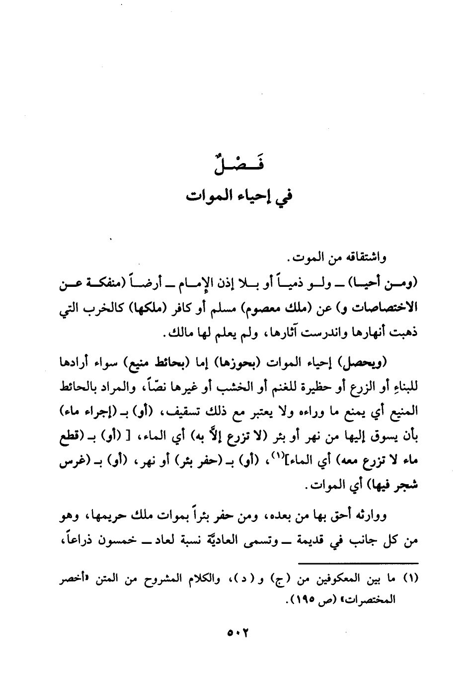 فِي إحْيَاء الْموَات. واشتقاقه من الْمَوْت وَمن أَحْيَا لَو ذِمِّيا أَو بِلَا إِذن من الإِمَام أَرضًا منفكة عَن الاختصاصات وَعَن ملك مَعْصُوم مُسلم أَو كَافِر ملكهَا كالخرب الَّتِي ذهبت أنهارها واندرست أثارها وَلم يعلم لَهَا مَالك وَيحصل إحْيَاء الْموَات بحوزها إِمَّا [بحائط منيع] سَوَاء أرادها للْبِنَاء أَو الزَّرْع أَو حَظِيرَة للغنم أَو الْخشب أَو غَيرهَا نصا. وَالْمرَاد بِالْحَائِطِ المنيع أَي يمْنَع مَا وَرَاءه وَلَا يعْتَبر مَعَ ذَلِك تسقيف أَو ب [إِجْرَاء مَاء] بِأَن يَسُوق إِلَيْهَا من نهر أَو بِئْر لَا تزرع إِلَّا بِهِ أَي المَاء أَوب قطع مَاء لَا تزرع مَعَه أَي المَاء [أَو] بِحَفر بِئْر أَو نهر أَو بغرس شجر فِيهَا أَي الْموَات.