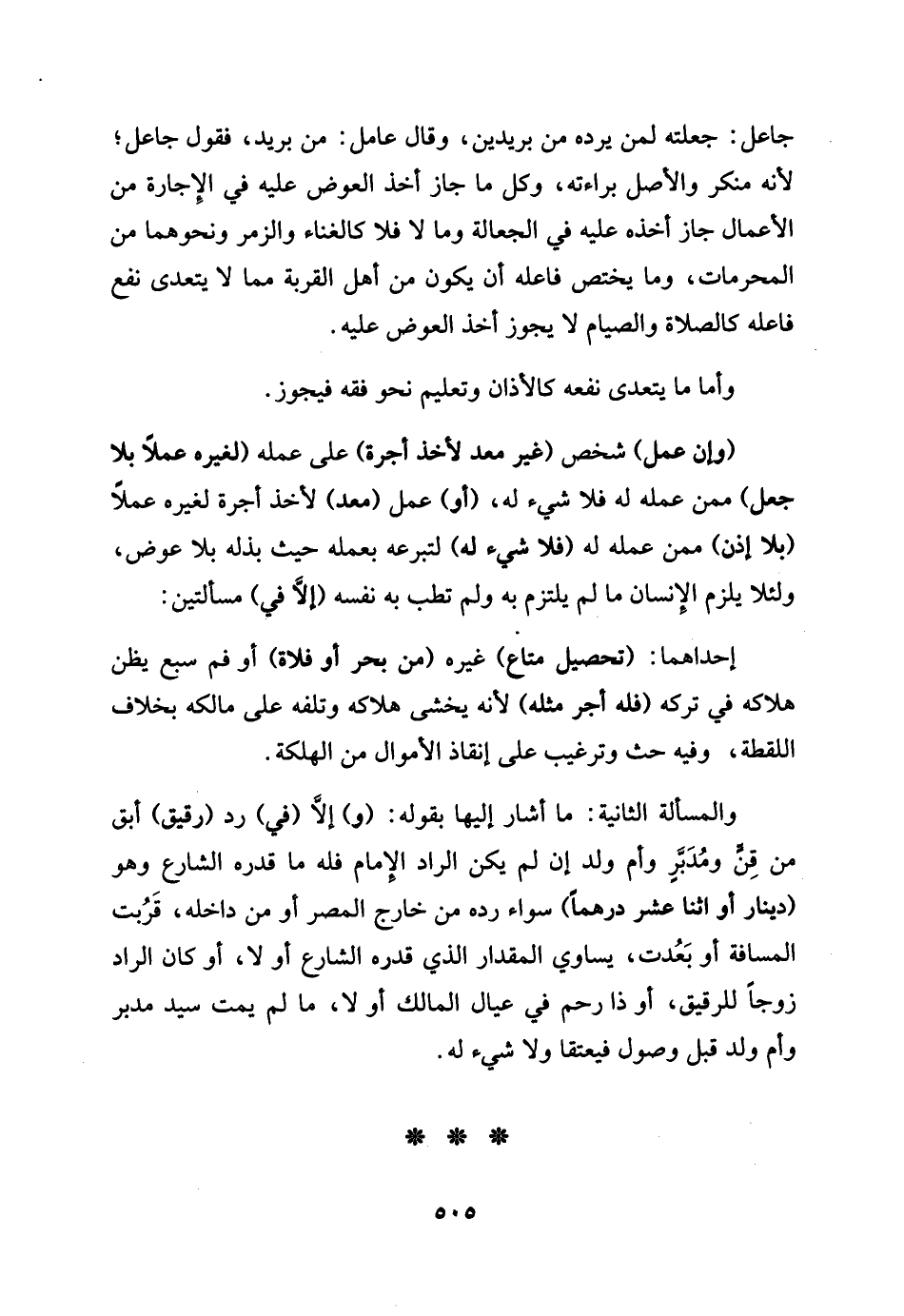 جَاعل: جعلته لمن يردهُ من بريدين , وَقَالَ عَامل من بريد فَقَوْل جَاعل لِأَنَّهُ مُنكر وَالْأَصْل بَرَاءَة , وكل مَا جَازَ أَخذ الْعِوَض علية فِي الْإِجَازَة من الْأَعْمَال جَازَ أَخذه علية فِي الْجعَالَة وَمَا لَا فَلَا , كالغناء وَالزمر وَنَحْوهمَا من الْمُحرمَات , وَمن يخْتَص فَاعله أَن يكون من أهل الْقرْيَة مِمَّا لَا يتَعَدَّى نفع فَاعله كَالصَّلَاةِ وَالصِّيَام لَا يجوز أَخذ الْعِوَض عَلَيْهِ. وَأما [مَا] يتَعَدَّى نَفعه كالأذان وَتَعْلِيم نَحْو فقه فَيجوز و [إِن عمل] شخص غير معد لأخذ أُجْرَة على عمله لغيره عملا [بِلَا جعل] مِمَّن لَهُ [أَو] عمل معد لاخذ أُجْرَة لغيره عملا [بِلَا إِذن] مِمَّن عمله لَهُ فَلَا شَيْء لَهُ لتبرعه بِعَمَلِهِ حَيْثُ بذله بِلَا عوض وَلِئَلَّا يلْزم الْإِنْسَان مَا لم يلْتَزم بِهِ وَلم تطب بِهِ نَفسه إِلَّا فِي مَسْأَلَتَيْنِ إِحْدَاهمَا [تَحْصِيل مَتَاع] غَيره [من بَحر أَو فلاة] أَو فَم سبع يظنّ هَلَاكه فِي تَركه فَلهُ أجر مثله لانه يخْشَى هَلَاكه وتلفه على مَالِكه بِخِلَاف اللّقطَة , وَفِيه حث وترغيب على إنقاذ الْأَمْوَال من الهلكة , والمسئلة الثَّانِيَة مَا أَشَارَ إِلَيْهَا بقوله وَإِلَّا فِي رد رَقِيق أبق من قن ومدبر وَأم ولد إِن لم يكن الرَّاد الإِمَام فَلهُ مَا قدره الشَّارِع وَهُوَ [دِينَار أَو اثْنَا عشر درهما] سَوَاء رده سَوَاء من خَارج الْمصر أَو من دَاخله قربت الْمسَافَة أَو بَعدت يُسَاوِي الْمِقْدَار الَّذِي قدره الشَّارِع أَو لَا , أَو كَانَ الرَّاد زوجا للرقيق أَو ذَا رحم فِي عِيَال الْمَالِك أَو لَا مَا لم يمت سيد مُدبر وآم ولد قبل وُصُول فيعتقا وَلَا شي لَهُ.