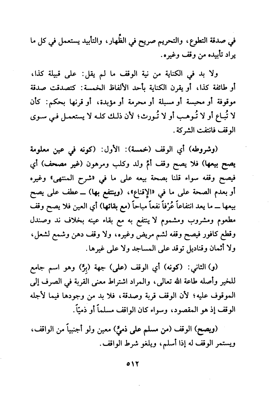 فِي صَدَقَة التَّطَوُّع وَالتَّحْرِيم وَيصِح الْوَقْف من مُسلم على ذمِّي معِين وَلَو أَجْنَبِيّا من الْوَاقِف , وَيسْتَمر الْوَقْف لَهُ إِذا أسلم , وبلغو شَرط الْوَاقِف ,