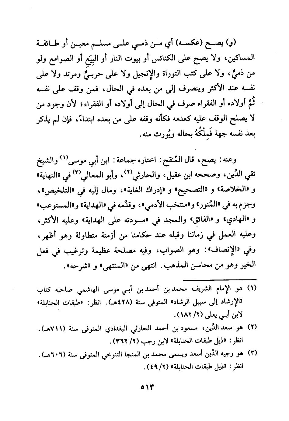 وَيصِح [عَكسه] أَي من ذمِّي على مُسلم معِين أَو طَائِفَة كالمساكين , ولايصح على الْكَنَائِس أَو بيُوت النَّار أَو البيع أَو الصوامع وَلَو من ذمِّي وَلَا على كتب التوارة وَالْإِنْجِيل وَلَا على حَرْبِيّ ومرتد وَلَا على نَفسه عِنْد الْأَكْثَر وينصرف