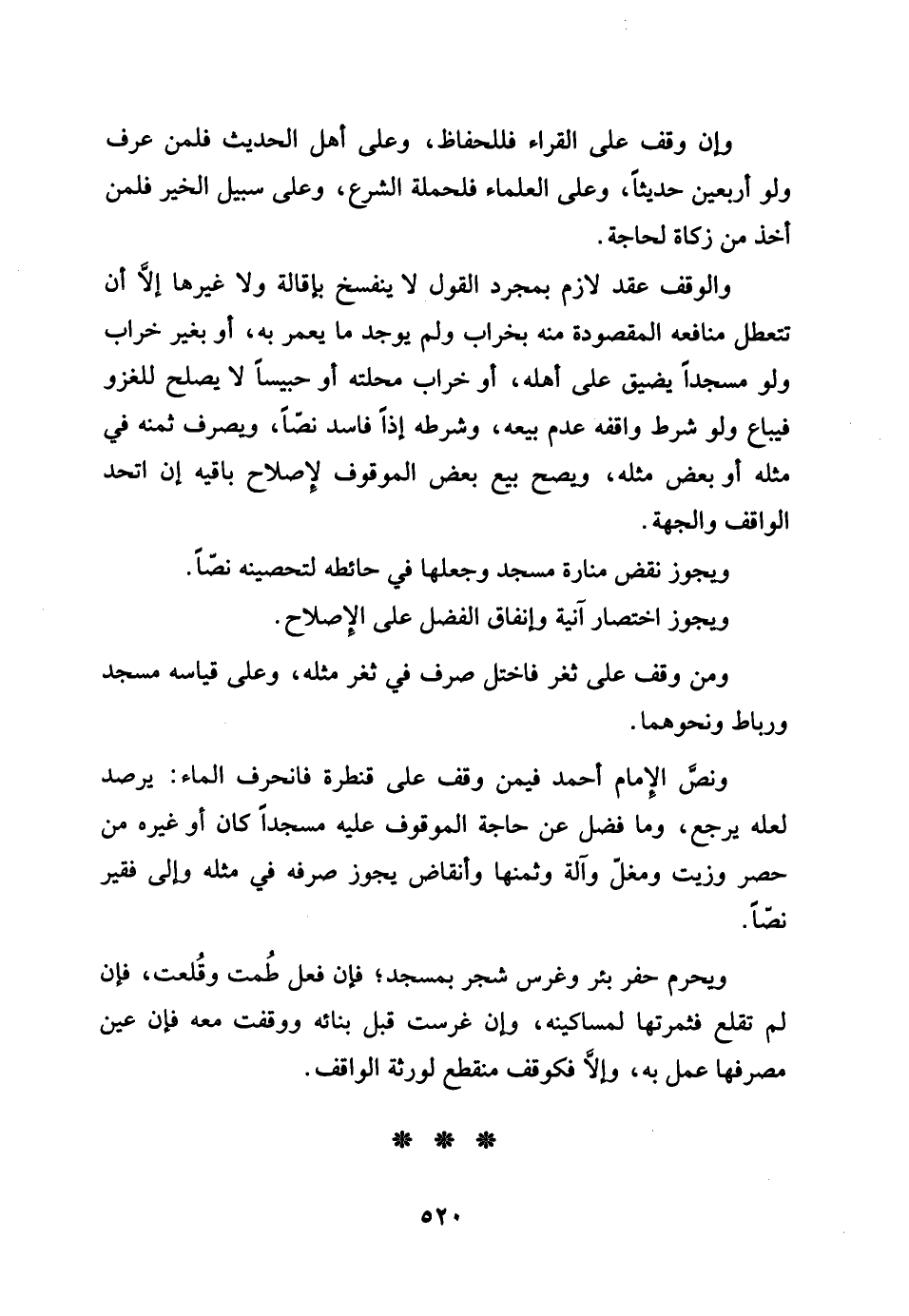 وَإِن وقف على الْقُرَّاء فللحافظ , وعَلى أهل الحَدِيث فَلِمَنْ عرف وَلَو أَرْبَعِينَ حَدِيثا , وعَلى الْعلمَاء فلحملة الشَّرْع , وعَلى سَبِيل الْخَيْر فَلِمَنْ أَخذ من زَكَاة لحَاجَة. وَالْوَقْف عقد لَازم بِمُجَرَّد القَوْل لَا يَنْفَسِخ بإقالة وَلَا غَيرهَا إِلَّا أَن تتعطل مَنَافِعه الْمَقْصُودَة مِنْهُ بخراب وَلم يُوجد مَا يعمر بِهِ , أَو بِغَيْر خراب وَلَو مَسْجِدا يضيق على أَهله , أَو خراب محلته أَو حَبِيسًا لَا يصلح للغزو فَيُبَاع وَلَو شَرط واقفه عدم بَيْعه وَشَرطه إِذن فَاسد نصا , وَيصرف ثمنه فِي مثله أَو بعض مثله , وَيصِح بيع بعض الْمَوْقُوف لإِصْلَاح بَاقِيَة إِن اتخذ الْوَاقِف والجهة. وَيجوز نقض مَنَارَة مَسْجِد وَجعلهَا فِي حَائِطه لتحصينه نصا. وَيجوز اخْتِصَار آنِية