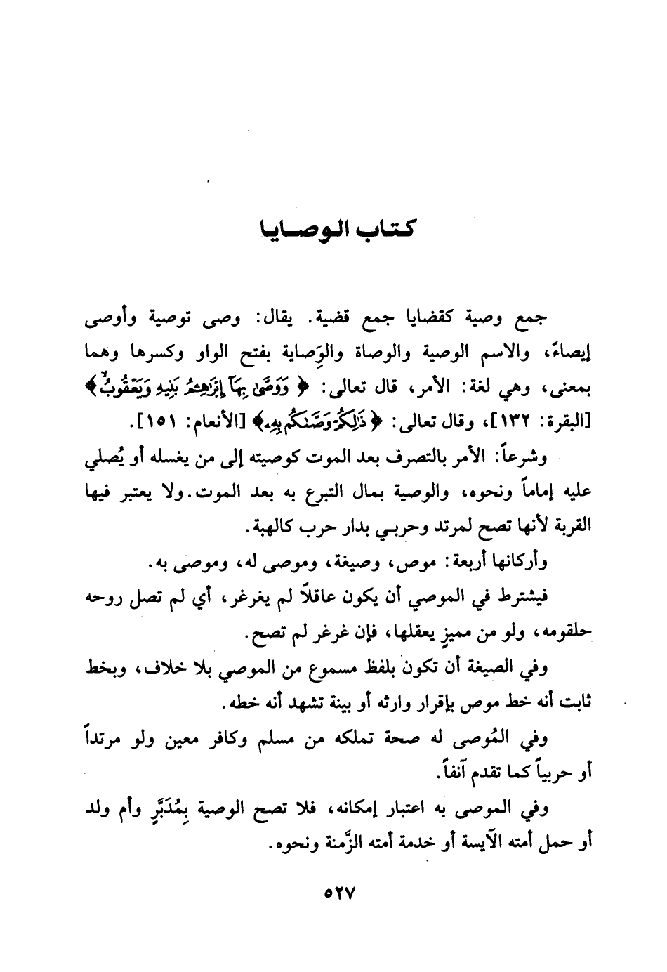 جمع وَصِيَّة كقضايا جمع قَضِيَّة يُقَال: وصّى توصية وَأوصى إيصاء , وَالِاسْم الْوَصِيَّة والوصاية بِفَتْح الْوَاو وَكسرهَا وهما بِمَعْنى , وَهِي لُغَة الْأَمر قَالَ تَعَالَى ١٩ ((ووصى بهَا إِبْرَاهِيم بنبه وَيَعْقُوب)) . قَالَ تَعَالَى ١٩ ((وَصَّاكُم بِهِ)) وَشرعا الْأَمر بِالتَّصَرُّفِ بعد الْمَوْت , كوصيته إِلَى من يغسلهُ أَو يصلى عَلَيْهِ إِمَامًا وَنَحْوه , وَالْوَصِيَّة بِمَال التَّبَرُّع بِهِ بعد الْمَوْت. وَلَا يعْتَبر فِيهَا الْقرْبَة؛ لِأَنَّهَا تصح لمرتد وحربي بدار حَرْب كَالْهِبَةِ. وأركانها أَرْبَعَة: موص وَصِيغَة ومرصى لَهُ وموصى بِهِ , فَيشْتَرط فِي المرصى أَن يكون عَاقِلا لم يغر غر أَي لم يصل روحه حلقومه , وَلَو من صَغِير يَعْقِلهَا فَإِن غرغر لم تصح. وَفِي الصِّيغَة أَن تكون بِلَفْظ مسموع من الْوَصِيّ بِلَا خلاف وبخط ثَابت أَنه خطّ موص بِإِقْرَار وَارثه أَو بَيِّنَة تشهد أَنه خطه. وَفِي الْمُوصى لَهُ صِحَة تملكه من سلم وَكَافِر معِين وَلَو مُرْتَدا أَو حَرْبِيّا كَمَا تقدم. وَفِي الْمُوصى بِهِ اعْتِبَار إِمْكَانه فَلَا تصح الْوَصِيَّة بِمد بر وَأم ولد أَو حمل أمته الآيسة أَو خدمَة أمته الزمنة وَنَحْوه.