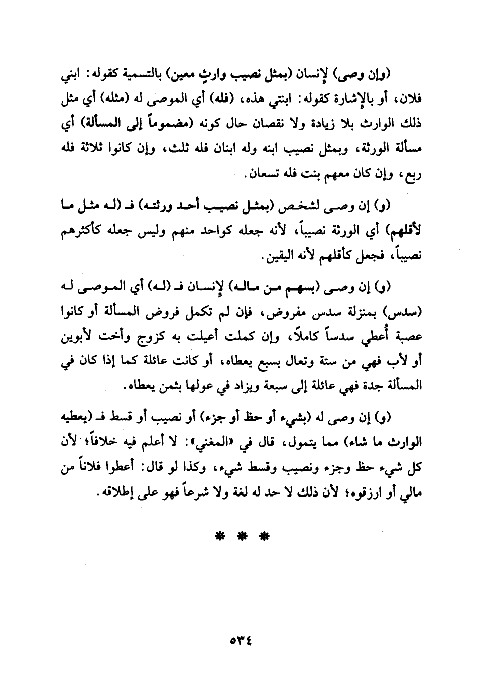 وان وصّى لإِنْسَان بِمثل نصيب وَارِث معِين بِالتَّسْمِيَةِ كَقَوْلِه: ابْني فلَان أَو بِالْإِشَارَةِ كَقَوْلِه: ابْنَتي هَذِه فَلهُ أَي الْمُوصى لَهُ مثله أَي مثل ذَلِك الْوَارِث بِلَا زِيَادَة وَلَا نُقْصَان حَال كَونه مَضْمُونا إِلَى الْمَسْأَلَة أَي مسالة الْوَرَثَة وبمثل نصيب ابْنه وَله ابْنَانِ فَلهُ ثلث , وَإِن كَانُوا ثَلَاثَة فَلهُ ربع , وَإِن كَانَ مَعَهم بنت فَلهُ تسعان وَإِن وصّى لشخص بِمثل نصيب أحد ورثته مثل مَا لاقلهم أَي الْوَرَثَة نَصِيبا لِأَنَّهُ جعله كأقلهم نَصِيبا فَجعل كأقلهم لِأَنَّهُ الْيَقِين. وَإِن وصّى لَهُ بِسَهْم من مَاله لإِنْسَان فَلهُ أَي الْمُوصى لَهُ سدس بِمَنْزِلَة سدس مَفْرُوض. فَإِن لم تكمل فروض الْمَسْأَلَة أَو كَانُوا عصبَة أعْطى سدسا كَامِلا، وَإِن كملت أعيلت بِهِ كَزَوج وَأُخْت لِأَبَوَيْنِ أَو لأَب فَهِيَ سِتَّة وتعال بِسبع يعطاه , أَو كَانَت عائلة كَمَا إِذا كَانَ فِي الْمَسْأَلَة جدة فَهِيَ عائلة إِلَى سَبْعَة وَيُزَاد فِي عولها بِثمن يعطاه ,