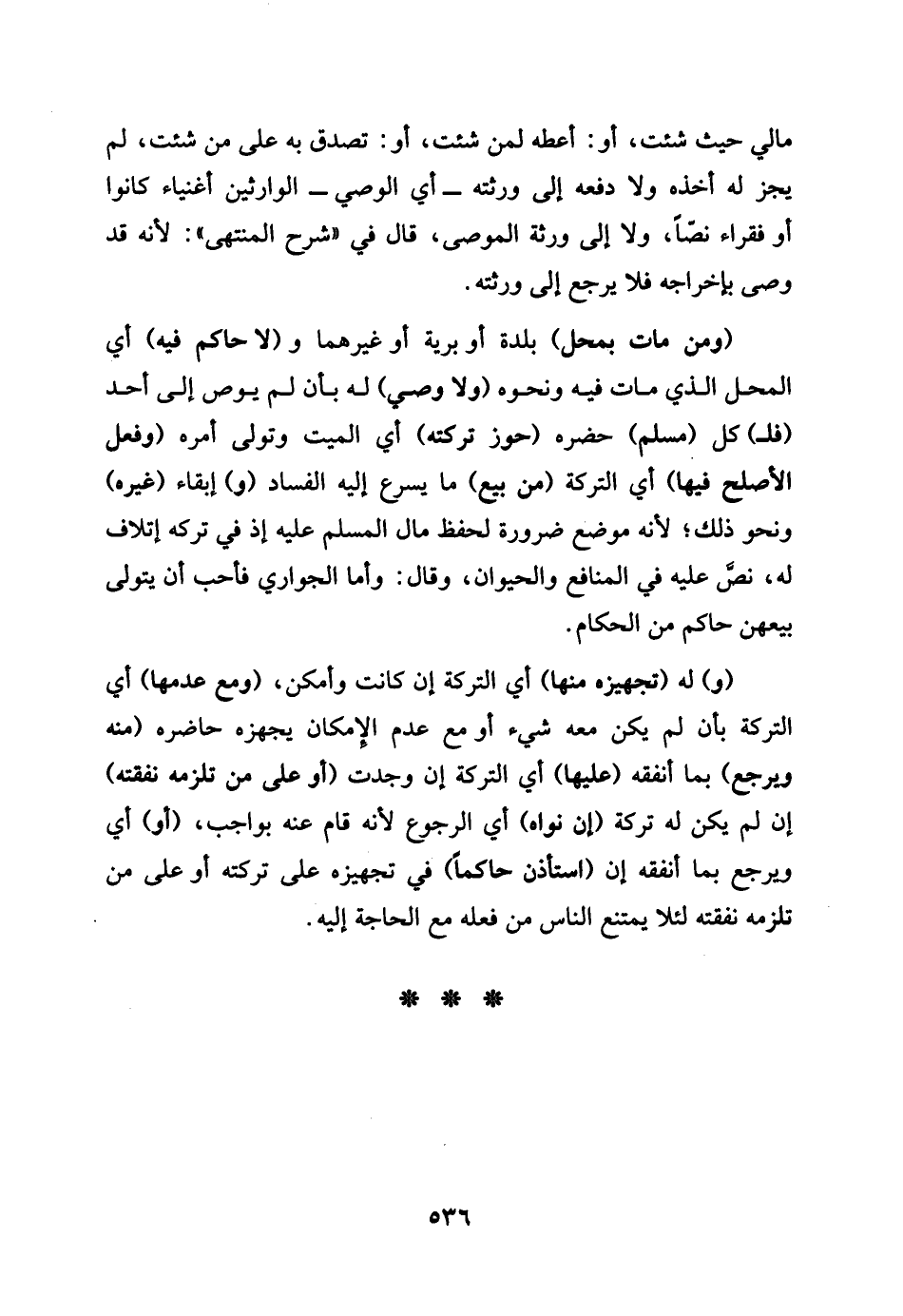 مَالِي حَيْثُ شِئْت , أَو أعْطه لمن شِئْت , أَو تصدق بِهِ على من شِئْت لم يجز لَهُ أَخذه وَلَا دَفعه إِلَى ورثته - أَي الْوَصِيّ - الْوَارِثين أَغْنِيَاء كَانُوا أَو فُقَرَاء - نصا , وَلَا إِلَى وَرَثَة الْمُوصى. قَالَ فِي شرع الْمُنْتَهى: لِأَنَّهُ قد وصّى بخراجه فَلَا يرجع إِلَى ورثته. وَمن مَاتَ بِمحل بَلْدَة أَو بَريَّة أَو غَيرهمَا لَا حَاكم فِيهِ أَي الْمحل الَّذِي مَاتَ فِيهِ وَنَحْوه وَلَا وصّى لَهُ بِأَن يوص إِلَى أحد فل كل مُسلم حَضَره حوز تركته أَي الْمَيِّت وَتَوَلَّى أمره وَفعل الْأَصْلَح فِيهَا أَي التَّرِكَة من بيع مَا يسْرع إِلَيْهِ الْفساد وإبقاء غَيره وَنَحْو ذَلِك لِأَنَّهُ مَوضِع ضَرُورَة لحفظ مَال الْمُسلم عَلَيْهِ , أَو فِي تَركه إِتْلَاف لَهُ نَص عَلَيْهِ فِي الْمَنَافِع وَالْحَيَوَان , وَقَالَ: وَأما الْجَوَارِي فَأحب أَن يتَوَلَّى بيعهنَّ حَاكم من الْحُكَّام , وَله تَجْهِيزه مِنْهَا أَي التَّرِكَة إِن كَانَت وَأمكن. وَمَعَ عدمهَا أَي التَّرِكَة بِأَن لم يكن مَعَه شَيْء أَو عدم الْإِمْكَان يجهزه حَاضِرَة مِنْهُ وَيرجع بِمَا أنفقهُ عَلَيْهَا أَي التَّرِكَة إِن وجدت أَو على من تلْزمهُ نَفَقَته إِن لم يكن لَهُ تَرِكَة إِن نَوَاه أَي الرُّجُوع؛ لِأَنَّهُ قَامَ عَنهُ بِوَاجِب أَو أَي وَيرجع بِمَا أنفقهُ إِن اسْتَأْذن حَاكما فِي تَجْهِيزه على تركته أَو على من تلْزمهُ نَفَقَته لِئَلَّا يمْتَنع النَّاس من فعله مَعَ الْحَاجة إِلَيْهِ.