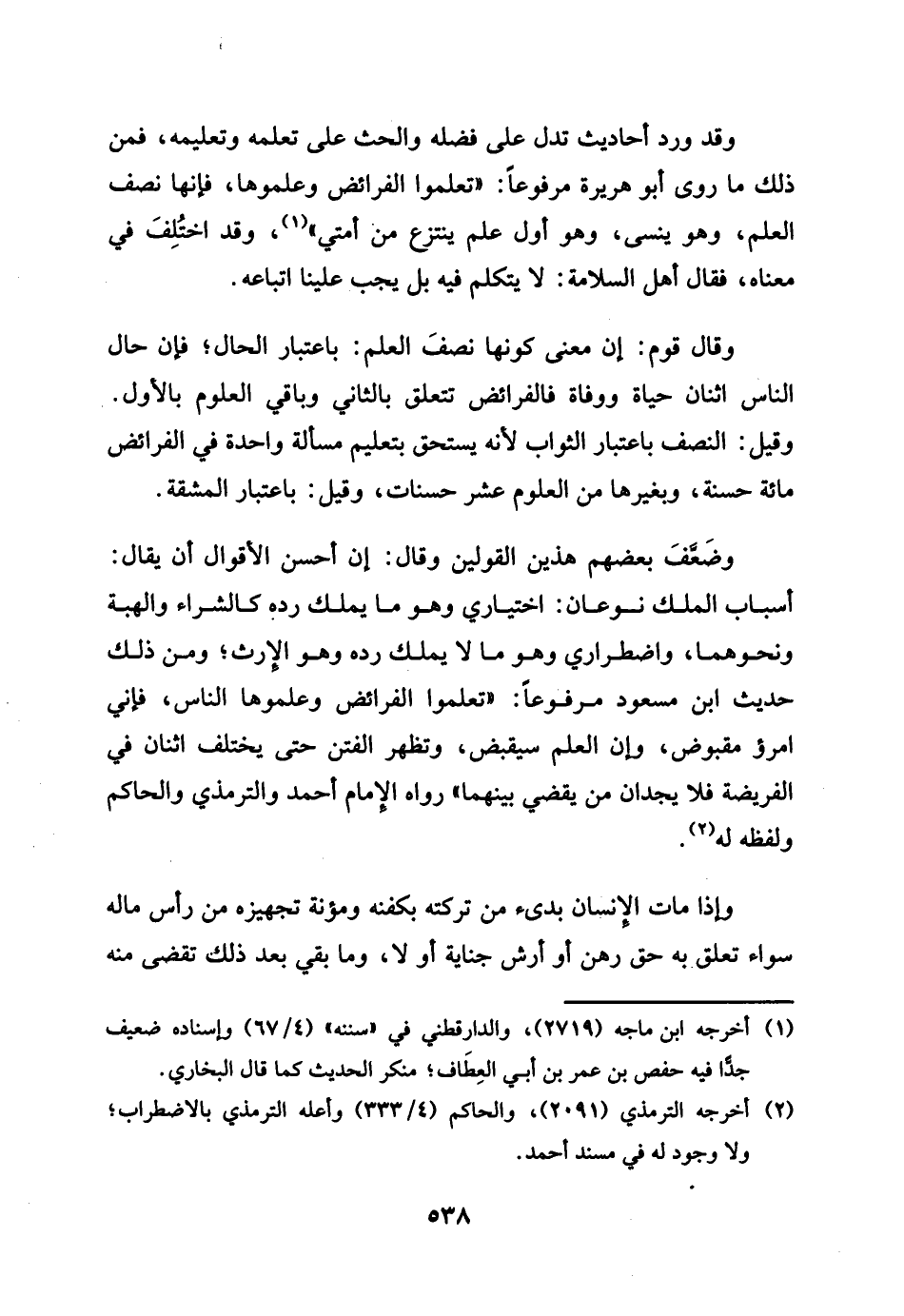 وَقد وَردت أَحَادِيث تدل على تعلمه وتعليمه , فَمن ذَلِك مَا روى أَبُو هُرَيْرَة مَرْفُوعا تعلمُوا الْفَرَائِض وعلموها , فَإِنَّهَا نصف الْعلم وَهُوَ ينسى , وَهُوَ أول علم ينتزع من أمتِي وَقد اخْتلف فِي مَعْنَاهُ , فَقَالَ أهل السَّلامَة: لَا يتَكَلَّم فِيهِ بل يجب علينا إتباعه. وَقَالَ قوم: إِن معنى كَونهَا نصف الْعلم بِاعْتِبَار الْحَال , فَإِن حَال النَّاس اثْنَان - حَيَاة ووفاة - فالفرائض مُتَعَلق بِالثَّانِي وَبَاقِي الْعُلُوم بِالْأولِ , وَقيل بِاعْتِبَار الثَّوَاب لِأَنَّهُ يسْتَحق بتعليم مَسْأَلَة وَاحِدَة فِي الْفَرَائِض مائَة حَسَنَة وبغيرها من الْعُلُوم عشر حَسَنَات،