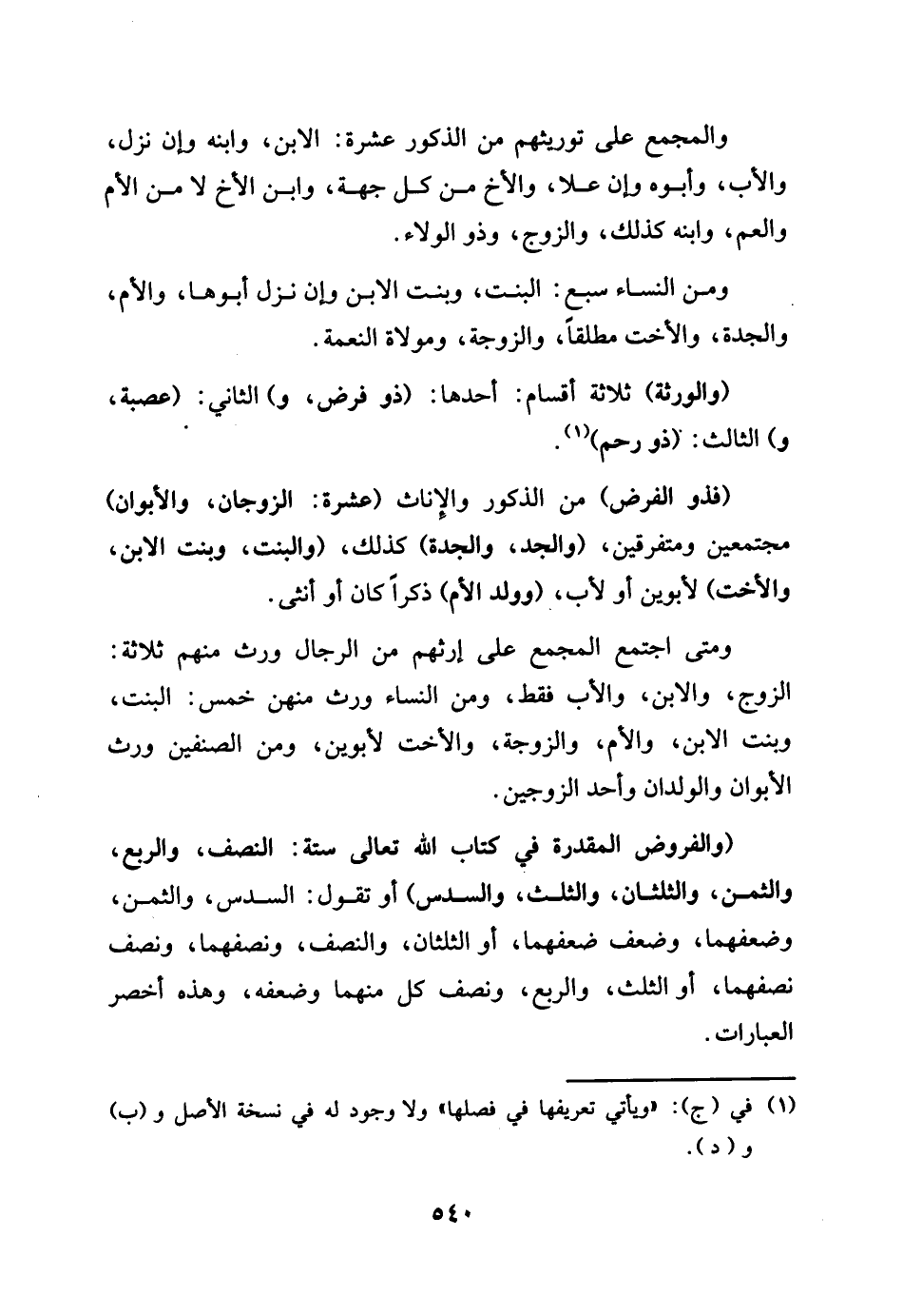 فرض , وَالثَّانِي عصبَة , وَالثَّالِث ذُو رحم وَيَأْتِي تَعْرِيفهَا فِي محلهَا. فذو الْفَرْض من الذُّكُور وَالْإِنَاث عشرَة: الزَّوْجَانِ والأبوان مُجْتَمعين وَمُتَفَرِّقِينَ , وَالْجد وَالْجدّة كَذَلِك , وَالْبِنْت , وَبنت الابْن , وَالْأُخْت لِأَبَوَيْنِ أَو لأَب , وَولد الْأُم ذكرا كَانَ أَو أُنْثَى. وَمَتى اجْتمع الْجمع على إرثهم من الرِّجَال وَورث مِنْهُم ثَلَاثَة: الزَّوْج , وَالِابْن