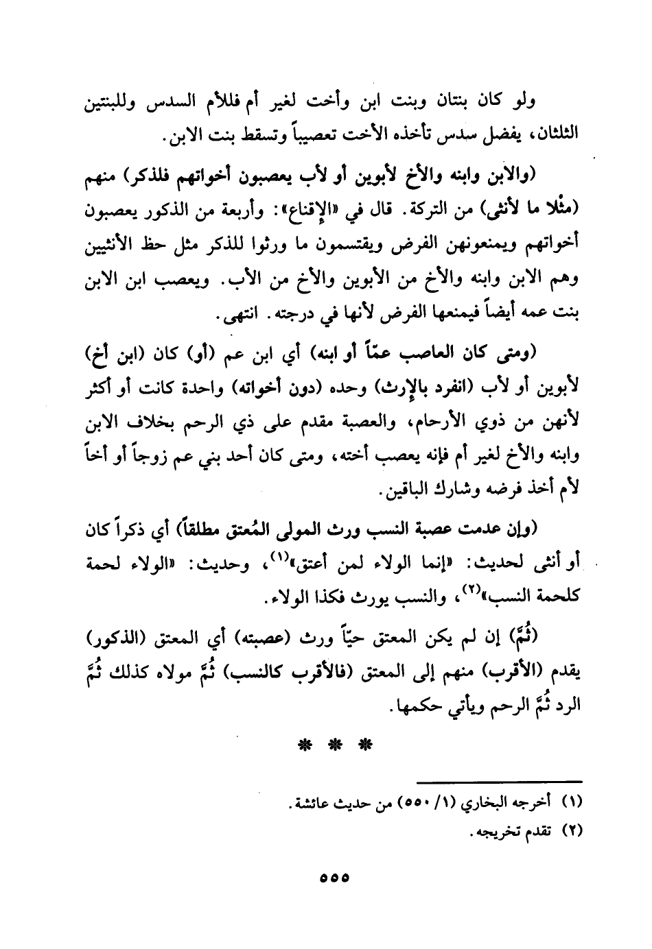 وَلَو كَانَ بنتان وَبنت ابْن وَأُخْت لغير أم وَأم فللأم السُّدس وللبنتين الثُّلُثَانِ يفضل سدس تَأْخُذهُ الْأُخْت تعصيبا وَتسقط بنت الابْن. وَالِابْن وَابْنه وَالْأَخ لِأَبَوَيْنِ أَو لأَب يعصبون أخواتهم فللذكر مِنْهُم مثلاما لأنثى من التَّرِكَة. قَالَ فِي الْإِقْنَاع: وَأَرْبَعَة من الذُّكُور يعصبون أخواتهم ويمنعونهن الْفَرْض ويقتسمون مَا ورثوا للذّكر مثل حَظّ الْأُنْثَيَيْنِ , وهم الابْن وَابْنَة وَالْأَخ من الْأَب. ويعصب ابْن الابْن بنت عَمه أَيْضا فيمنعها الْفَرْض لِأَنَّهَا فِي دَرَجَته. انْتهى. وَمَتى كَانَ العاصب عَمَّا أَو ابْنه أَي ابْن عَم أَو كَانَ ابْن أَخ لِأَبَوَيْنِ أَو لأَب انْفَرد بِالْإِرْثِ وَحده دون أخواته وَاحِدَة كَانَت أَو أَكثر , لِأَنَّهُنَّ من ذَوي الْأَرْحَام والعصبة مقدم على ذِي الرَّحِم، بِخِلَاف الابْن وَابْنه وَالْأَخ لغير أم فَإِنَّهُ يعصب أُخْته وَمَتى كَانَ أحد بني عَم زوجا أَو أَخا لَام اخذ فَرْضه وشارك البَاقِينَ وَإِن عدمت عصبَة النّسَب ورث الْمولى الْمُعْتق مُطلقًا أَي ذكرا كَانَ أَو أُنْثَى لحَدِيث انما الْوَلَاء لمن اعْتِقْ وَحَدِيث (الْوَلَاء لحْمَة كلحمة النّسَب) وَالنّسب يُورث فَكَذَا الْوَلَاء ثمَّ أَن لم يكن الْمُعْتق حَيا ورث عصبته أَي الْمُعْتق الذُّكُور يقدم الْأَقْرَب مِنْهُم إِلَى الْمُعْتق فَالْأَقْرَب كالنسب ثمَّ مَوْلَاهُ كَذَلِك ثمَّ الرَّد ثمَّ الرَّحِم وَيَأْتِي حكمهَا.