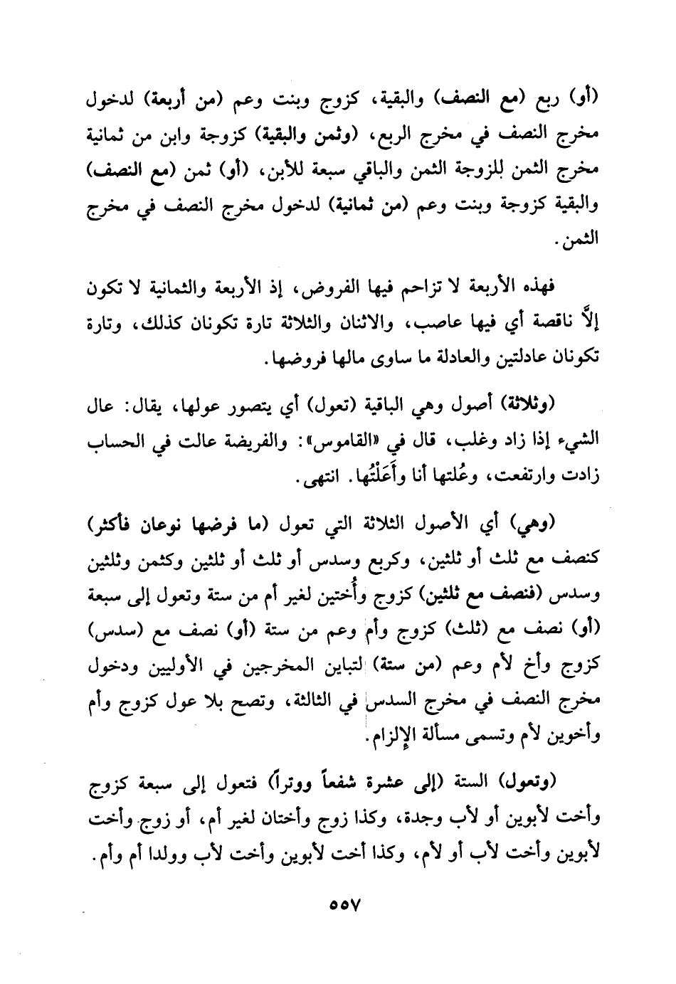 أَو ربع مَعَ النّصْف والبقية كَزَوج وَبنت عَم من أَرْبَعَة لدُخُول مخرج النّصْف فِي مخرج الرّبع وَثمن والبقية كَزَوج وَابْن من ثَمَانِيَة مخرج الثّمن للزَّوْجَة الثّمن وَالْبَاقِي سَبْعَة للِابْن أَو ثمن مَعَ النّصْف والبقية كَزَوْجَة وَبنت عَم من ثَمَانِيَة لدُخُول مخرج النّصْف فِي مخرج الثّمن. هَذِه الْأَرْبَعَة لَا تزاحم فِيهَا الْفُرُوض إِذْ الْأَرْبَعَة وَالثَّمَانِيَة لَا تكون إِلَّا نَاقِصَة أَي فِيهَا عاصب , والاثنان وَالثَّلَاثَة تَارَة تَكُونَانِ كَذَلِك وَتارَة تَكُونَانِ عادلتين , والعادلة مَا سَاوَى مَالهَا فروضها. وَثَلَاثَة أصُول وَهِي الْبَاقِيَة تعول أَي يتَصَوَّر عولها , يُقَال عَال الشَّيْء إِذا زَاد وَغلب , قَالَ فِي الْقَامُوس:
