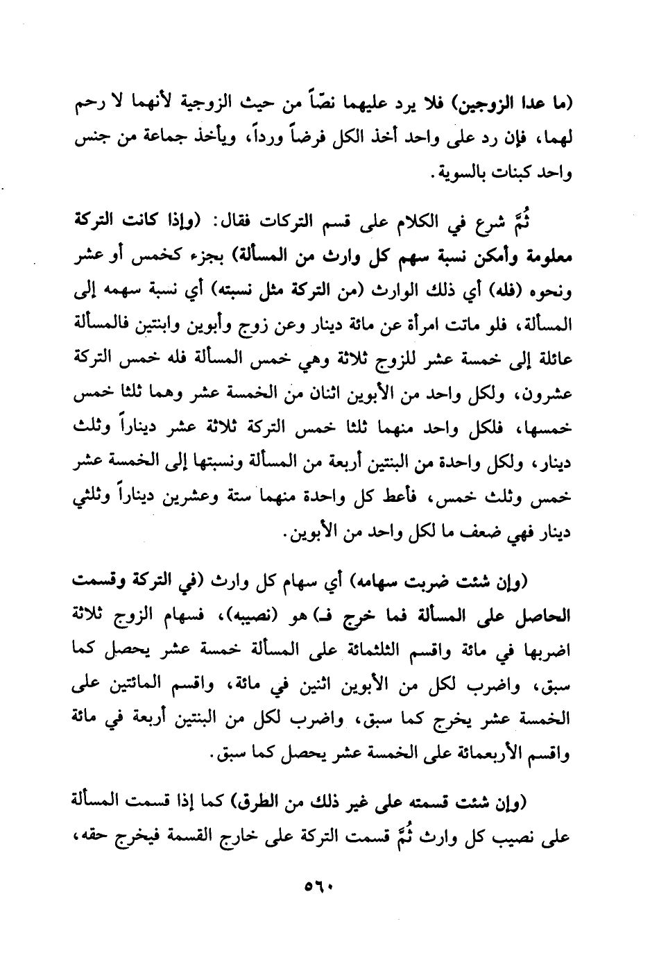 مَا عدا الزَّوْجَيْنِ فَلَا يرد عَلَيْهِمَا نصا من حَيْثُ الزَّوْجِيَّة لِأَنَّهُمَا رحم لَهما. فَإِن رد على وَاحِد أَخذ الْكل فرضا وردا. وَيَأْخُذ جمَاعَة من جنس وَاحِد كبنات بِالسَّوِيَّةِ. ثمَّ شرع فِي الْكَلَام على قسم التركات فَقَالَ: وَإِذا كَانَت التَّرِكَة مَعْلُومَة وَأمكن نِسْبَة سهم كل وَارِث من الْمَسْأَلَة بِجُزْء كخمس أَو عشر وَنَحْوه فَلهُ أَي ذَلِك الْوَارِث من التَّرِكَة مثل نسبته أَي نِسْبَة سَهْمه إِلَى الْمَسْأَلَة , فَلَو مَاتَت امْرَأَة من مائَة دِينَار وَعَن زوج وأبوين وابنتين فَالْمَسْأَلَة عائلة الى خَمْسَة عشر , للزَّوْج ثَلَاثَة وَهِي خمس الْمَسْأَلَة فَلهُ خمس التَّرِكَة عشرُون وَلكُل وَاحِد من الْأَبَوَيْنِ اثْنَان من الْخَمْسَة عشر وهما ثلثا خمسها فَلِكُل وَاحِد مِنْهُمَا ثلثا خمس التَّرِكَة ثَلَاثَة عشر دِينَارا وَثلث دِينَار , وَلكُل وَاحِد من البنتين أَرْبَعَة من الْمَسْأَلَة ونسبتها إِلَى الْخَمْسَة عشر خمس وَثلث خمس فأعط كل وَاحِدَة مِنْهُمَا سِتَّة وَعشْرين دِينَارا وثلثي دِينَار فَهِيَ ضعف مَا لكل وَاحِد من الْأَبَوَيْنِ. وَإِن شِئْت ضربت سهامه أَي سِهَام كل وَارِث فِي التَّرِكَة وَقسمت الْحَاصِل على الْمَسْأَلَة فَمَا خرج ف هُوَ نصِيبه , فسهام الزَّوْج ثَلَاثَة اضربها فِي مائَة واقسم الثلاثمائة على الْمَسْأَلَة خَمْسَة عشر يحصل كَمَا سبق , وَاضْرِبْ لكل من الْأَبَوَيْنِ اثْنَيْنِ فِي مائَة واقسم الْمِائَتَيْنِ على الْخَمْسَة عشر يخرج كَمَا سبق وَاضْرِبْ لكل من البنتين أَرْبَعَة فِي مائَة واقسم الأربعمائة على الْخَمْسَة عشر يحصل كَمَا سبق وان شِئْت قسمته على غير ذَلِك من الطّرق كَمَا إِذا قسمت الْمَسْأَلَة على نصيب كل وَارِث ثمَّ قسمت التَّرِكَة على خَارج الْقِسْمَة فَيخرج حَقه ,