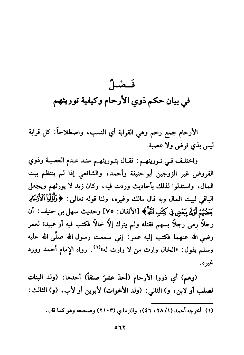 فِي بَيَان حكم ذَوي الْأَرْحَام وَكَيْفِيَّة توريثهم. الْأَرْحَام جمع رحم وَهِي الْقَرَابَة أَي النّسَب , وَاصْطِلَاحا كل قرَابَة لَيْسَ بِذِي فرض وَلَا عصبَة. وَاخْتلف فِي توريثهم فَقَالَ بتوريثهم عِنْد عدم الْعصبَة وَذَوي الْفُرُوض غير الزَّوْجَيْنِ أَبُو حنيفَة وَأحمد , وَالشَّافِعِيّ إِذا لم يَنْتَظِم بَيت المَال , وَاسْتَدَلُّوا لذَلِك بِأَحَادِيث وَردت فِيهِ , وَكَانَ زيد لَا يورثهم وَلَا يَجْعَل الْبَاقِي لبيت المَال وَبِه قَالَ مَالك وَغَيره , وَلنَا قَوْله تَعَالَى: وأولو الْأَرْحَام بَعضهم أولى بِبَعْض فِي كتاب اللَّه وَحَدِيث سهل بن حنيف أَن رجلا رمى رجلا بِسَهْم فَقتله , وَلم يتْرك إِلَّا خالا فَكتب فِيهِ أَبُو عبيده لعمر رَضِي الله عَنْهُمَا فَكتب إِلَيْهِ عمر أَنِّي سَمِعت رَسُول الله يَقُول: الْخَال وَارِث من لَا وَارِث لَهُ. رَوَاهُ الإِمَام أَحْمد وَورد غَيره , وهم أَي ذَوُو الْأَرْحَام أحد عشر صنفا أَحدهَا ولد الْبَنَات الصلب أَو لِابْنِ , وَالثَّانِي ولد الْأَخَوَات لِأَبَوَيْنِ أَو لأَب وَالثَّالِث