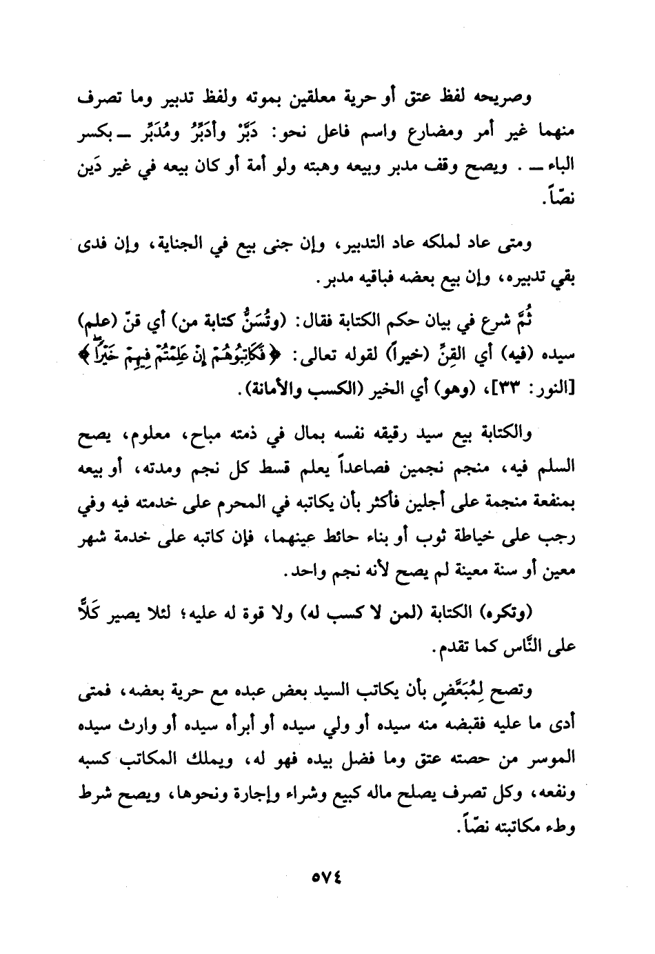ثمَّ شرع فِي بَيَان حكم الْكِتَابَة فَقَالَ وَتسن كِتَابَة من علم سَيّده فِيهِ أَي ألقن خيرا لقَوْله تَعَالَى ١٩ (: (فكاتبوهم إِن علمْتُم فيهم خيرا)) وَهُوَ أَي الْخَيْر الْكسْب وَالْأَمَانَة. وَالْكِتَابَة بيع سيد رَقِيقه نَفسه بِمَال فِي ذمَّته مُبَاح مَعْلُوم يَصح السّلم فِيهِ منجم نجمين فَصَاعِدا يعلم قسط كل نجم ومدته. أَو بَيْعه بمنفعه منجمة إِلَى أجلين فَأكْثر بِأَن يكاتبه فِي الْمحرم على خدمته فِيهِ وَفِي رَجَب على خياطَة ثوب أَو بِنَاء حَائِط عينهما , فان كَاتبه على خدمَة شهر معِين أَو سنة مُعينَة لم يَصح لِأَنَّهُ نجم وَاحِد. وَتَكون الْكِتَابَة لمن لَا كسب لَهُ وَلَا قُوَّة لَهُ عَلَيْهِ لِئَلَّا يصير كلا النَّاس مَا تقدم. وَتَصِح كِتَابَة الْمبعض بِأَن يُكَاتب السَّيِّد بعض عبد حريَّة بعضه فَمَتَى أدّى مَا عَلَيْهِ فَقَبضهُ مِنْهُ سَيّده أَو ولى سَيّده أَو أَبرَأَهُ سَيّده أَو وَارِث سَيّده المسر من حِصَّته عتق وَمَا فضل بِيَدِهِ فَهُوَ لَهُ , وَيملك الْمكَاتب كَسبه ونفعه وكل تصرف يصلح مَاله كَبيع وَشِرَاء واجارة وَنَحْوهَا وَيصِح شَرط وَطْء مُكَاتبَته نصا