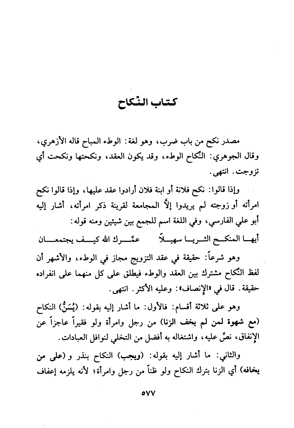 كتاب النِّكَاح. مصدر نكح من بَاب ضرب وَهُوَ لُغَة الْوَطْء الْمُبَاح قَالَه الْأَزْهَرِي وَقَالَ الْجَوْهَرِي: النِّكَاح الْوَطْء وَقد يكون العقد , ونكحتها ونكحت أَي تزوجت. انْتهى. وَإِذا قَالُوا: نكح فُلَانَة أَو ابْنة فلَان أَرَادوا عقد عَلَيْهَا وَإِذا قَالُوا نكح امْرَأَته أَو زَوجته لم يُرِيدُوا إِلَّا المجامعة لقَرِينَة ذكر امْرَأَته أَشَارَ أليه أَو عَليّ الْفَارِسِي. وَفِي اللُّغَة اسْم للْجمع بَين شَيْئَيْنِ وَمِنْه قَوْله: أَيهَا المنكح الثريا سهيلا عمرك الله كَيفَ يَجْتَمِعَانِ وَهُوَ شرعا حَقِيقَة فِي عقد التَّزْوِيج مجَاز فِي الْوَطْء وَالْأَشْهر أَن لفظ النِّكَاح مُشْتَرك فِي العقد وَالْوَطْء فيطلق على كل مِنْهُمَا على انْفِرَاده حَقِيقَة. قَالَ فِي الْإِنْصَاف: وَعَلِيهِ الْأَكْثَر. انْتهى. وَهُوَ على ثَلَاثَة أَقسَام: فَالْأول مَا أَشَارَ أليه بقوله يسن النِّكَاح مَعَ شَهْوَة لمن لم يخف الزِّنَا من رجل وَامْرَأَة وَلَو فَقِيرا عَاجِزا عَن الْإِنْفَاق نَص عَلَيْهِ واشتغاله بِهِ أفضل من التخلي لنوافل الْعِبَادَات. وَالثَّانِي: مَا أَشَارَ إِلَيْهِ بقوله وَيجب النِّكَاح بِنذر وعَلى من يخافه أَي الزِّنَا بترك النِّكَاح وَلَو ظنا من رجل وَامْرَأَة لانه يلْزمه إعفاف