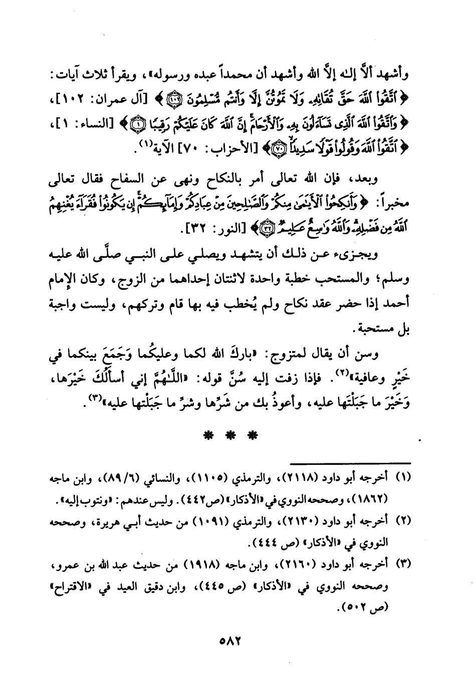 وَالْمُسْتَحب خطْبَة وَاحِدَة لاثنتان إِحْدَاهمَا من الزَّوْجَة , وَكَانَ الإِمَام أَحْمد إِذا حضر عقد نِكَاح وَلم يخْطب فِيهِ بهَا قَامَ وتركهم , وَلَيْسَت وَاجِبَة بل مُسْتَحبَّة. وَسن أَن يُقَال لمتزوج: بَارك الله لَكمَا وعليكما وَجمع بَيْنكُمَا فِي خير وعافية. فَإِذا زفت إِلَيْهِ سنّ قَوْله: اللَّهُمَّ إِنِّي أَسأَلك خَيرهَا و [خير] مَا جبلتها عَلَيْهِ , وَأَعُوذ بك من شَرها وَشر مَا جبلتها عَلَيْهِ.