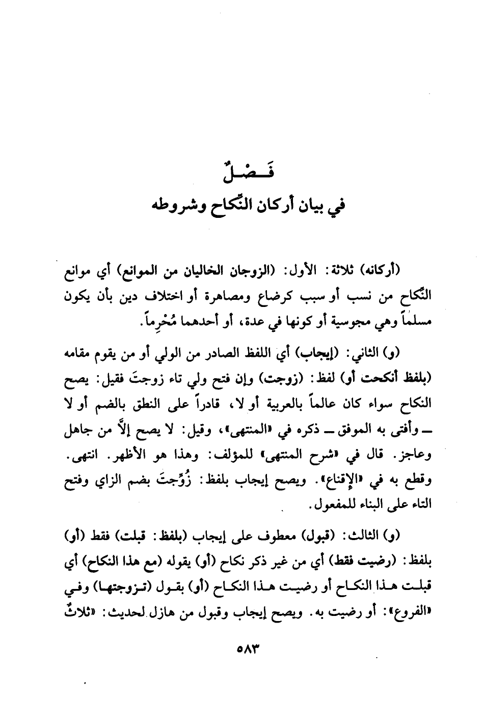 فصل فِي بَيَان أَرْكَان النِّكَاح وشروطه أَرْكَانه ثَلَاثَة: الأول الزَّوْجَانِ الخاليان من الْمَوَانِع أَي مَوَانِع النِّكَاح من نسب أَو سَبَب كرضاع ومصاهرة وَاخْتِلَاف دين بِأَن يكون مُسلما وَهِي مَجُوسِيَّة أَو كَونهَا فِي عدَّة , أَو أَحدهمَا محرما. وَالثَّانِي إِيجَاب أَي اللَّفْظ الصَّادِر من الْوَلِيّ أَو من يقوم مقَامه بِلَفْظ أنكحت أَو لفظ زوجت وَإِن فتح ولى تَاء زوجت فَقيل يَصح النِّكَاح سَوَاء كَانَ عَالما بِالْعَرَبِيَّةِ أَو لَا , قَادِرًا على النُّطْق بِالضَّمِّ أَو لَا - وَأفْتى بِهِ الْمُوفق - ذكره فِي الْمُنْتَهى , وَقيل لَا يَصح إِلَّا من جَاهِل وعاجز قَالَ فِي شرح الْمُنْتَهى للمؤلف: وَهَذَا هُوَ الْأَظْهر. انْتهى. وَقطع بِهِ فِي الْإِقْنَاع. وَيصِح إِيجَاب بِلَفْظ زوجت بِضَم الزاى وَفتح التَّاء على الْبناء للْمَفْعُول.
