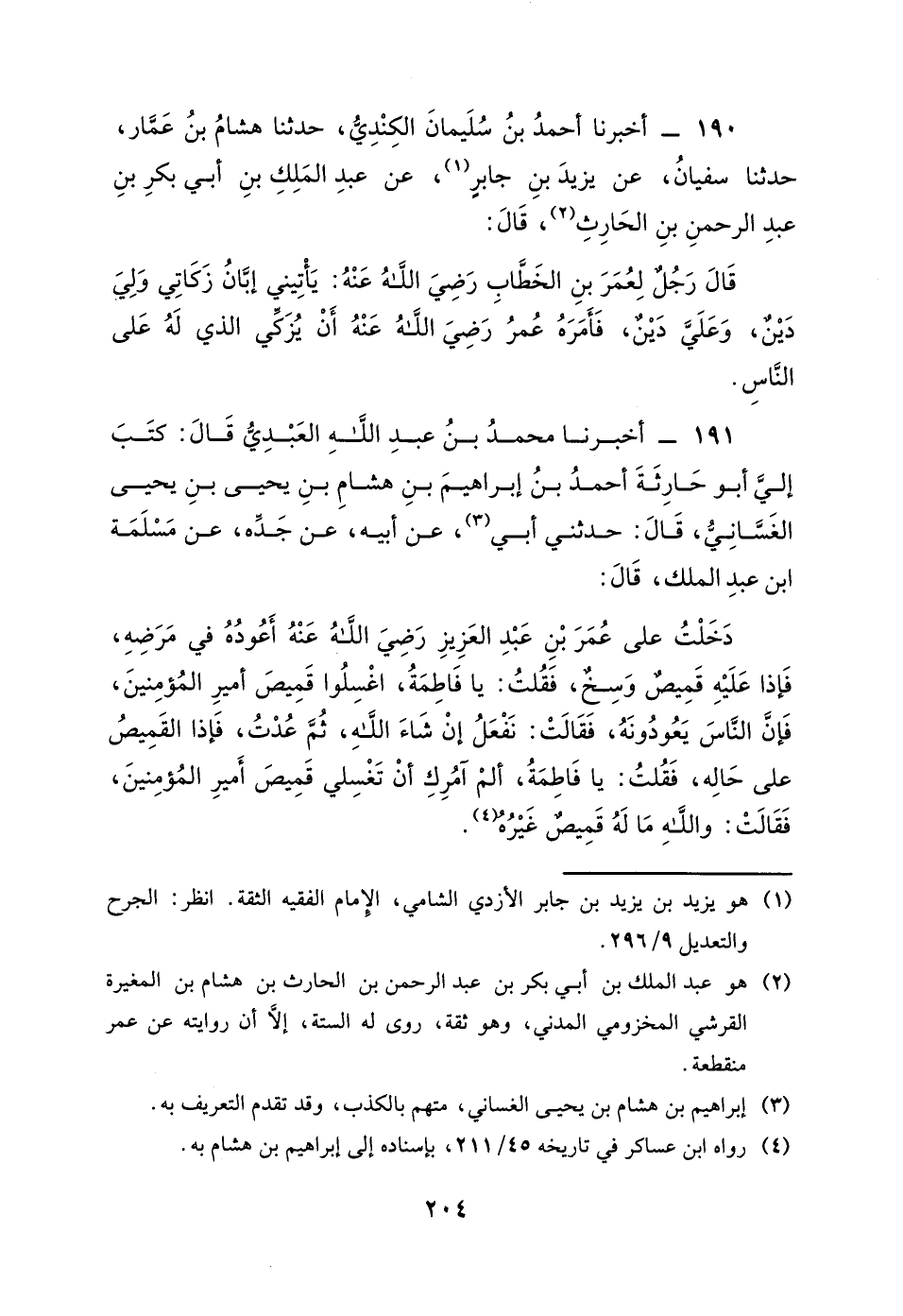 191 - أَخْبَرَنَا مُحَمَّدُ بْنُ عَبْدِ اللَّهِ الْعَبْدِيُّ، قَالَ: كَتَبَ إِلَيَّ أَبُو حَارِثَةَ أَحْمَدُ بْنُ إِبْرَاهِيمَ بْنِ هِشَامِ بْنِ يَحْيَى بْنِ يَحْيَى الْغَسَّانِيُّ، قَالَ: حَدَّثَنِي أَبِي، عَنْ أَبِيهِ، عَنْ جَدِّهِ، عَنْ مَسْلَمَةَ بْنِ عَبْدِ الْمَلِكِ، قَالَ " دَخَلْتُ عَلَى عُمَرَ بْنِ عَبْدِ الْعَزِيزِ رَضِيَ اللَّهُ عَنْهُ أَعُودُهُ فِي مَرَضِهِ، فَإِذَا عَلَيْهِ قَمِيصٌ وَسِخٌ، فَقُلْتُ: يَا فَاطِمَةُ، اغْسِلُوا قَمِيصَ أَمِيرِ الْمُؤْمِنِينَ، فَإِنَّ النَّاسَ يَعُودُونَهُ، فَقَالَتْ: نَفْعَلُ إِنْ شَاءَ اللَّهُ، ثُمَّ عُدْتُ، فَإِذَا الْقَمِيصُ عَلَى حَالِهِ، فَقُلْتُ: يَا فَاطِمَةُ، أَلَمْ آمُرْكِ أَنْ تَغْسِلِي قَمِيصَ أَمِيرِ الْمُؤْمِنِينَ، فَقَالَتْ: وَاللَّهِ مَا لَهُ قَمِيصٌ غَيْرُهُ ".