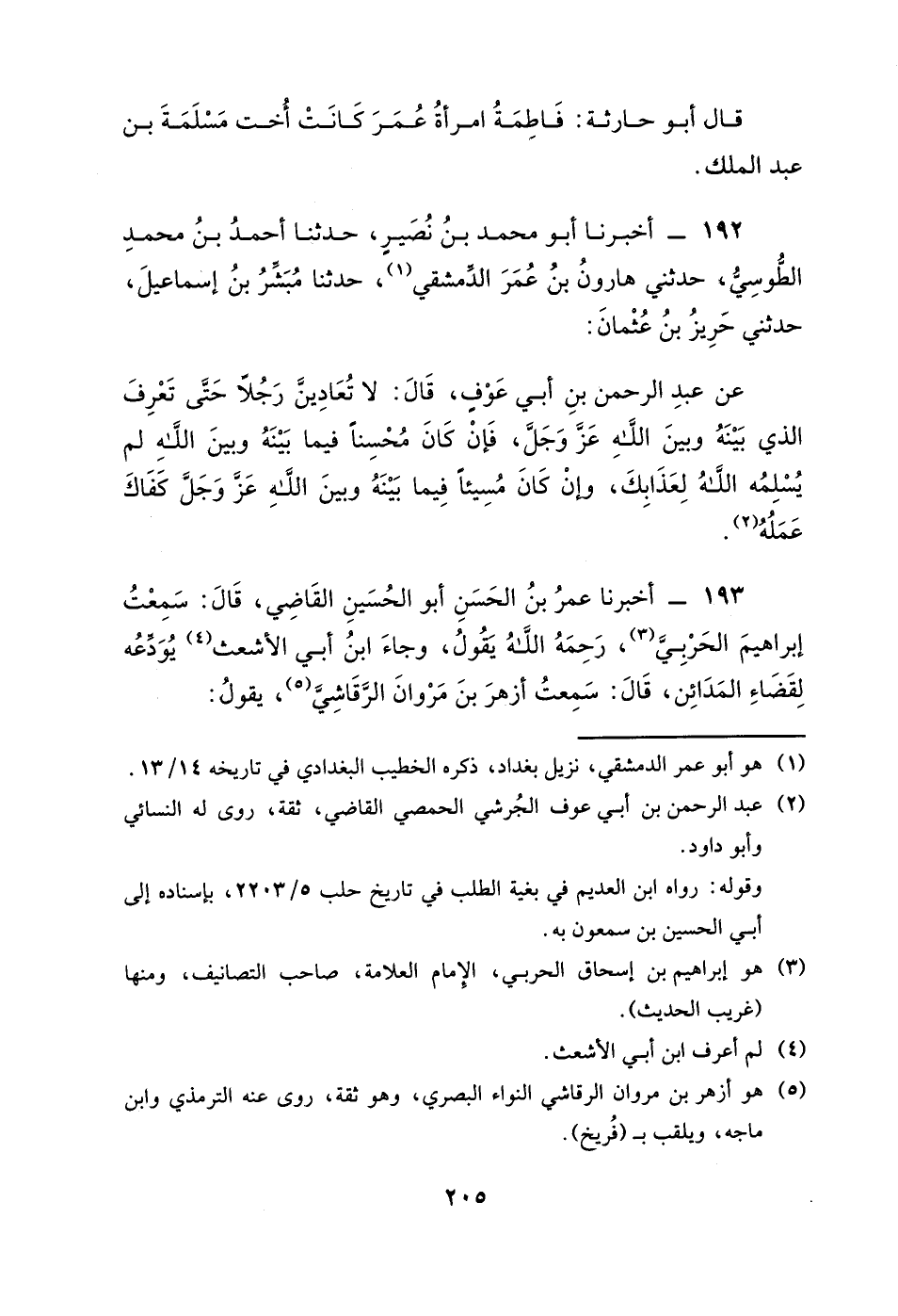 193 - أَخْبَرَنَا عُمَرُ بْنُ الْحَسَنِ أَبُو الْحُسَيْنِ الْقَاضِي، قَالَ: سَمِعْتُ إِبْرَاهِيمَ الْحَرْبِيَّ، رَحِمَهُ اللَّهُ يَقُولُ: وَجَاءَ ابْنُ أَبِي الأَشْعَثِ، يُوَدِّعُهُ لِقَضَاءِ الْمَدَائِنِ، قَالَ: سَمِعْتُ أَزْهَرَ بْنَ مَرْوَانَ الرَّقَاشِيَّ، يَقُولُ: