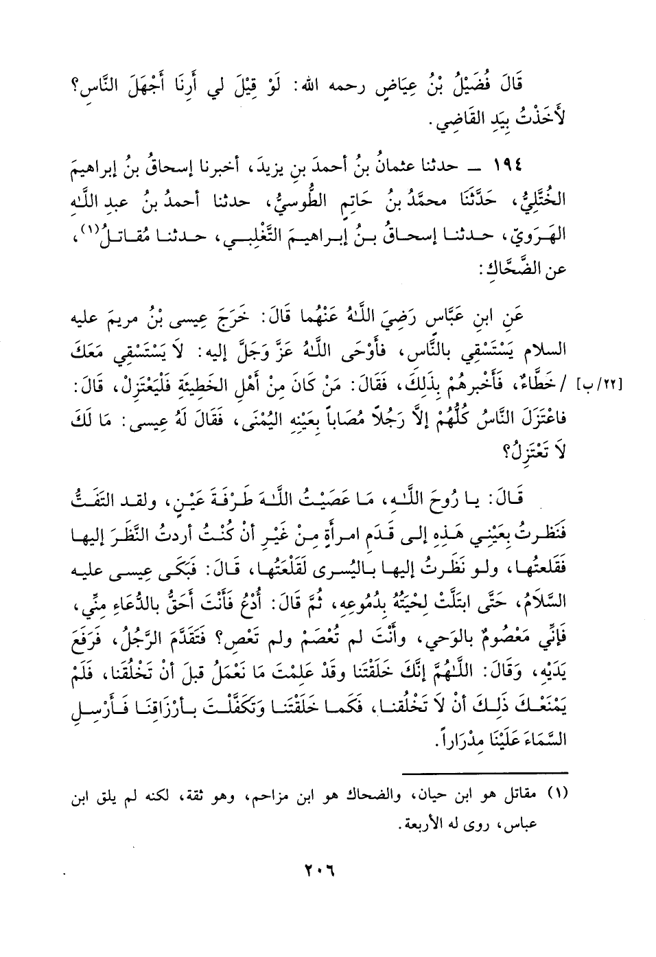 194 - حَدَّثَنَا عُثْمَانُ بْنُ أَحْمَدَ بْنِ يَزِيدَ، أَخْبَرَنَا إِسْحَاقُ بْنُ إِبْرَاهِيمَ الْخُتُّلِيُّ، حَدَّثَنَا مُحَمَّدُ بْنُ حَاتِمٍ الطُّوسِيُّ، حَدَّثَنَا أَحْمَدُ بْنُ عَبْدِ اللَّهِ الْهَرَوِيُّ، حَدَّثَنَا إِسْحَاقُ بْنُ إِبْرَاهِيمَ التَّغْلَبِيُّ، حَدَّثَنَا مُقَاتِلٌ، عَنِ الضَّحَّاكِ، عَنِ ابْنِ عَبَّاسٍ، رَضِيَ اللَّهُ عَنْهُمَا، قَالَ: " خَرَجَ عِيسَى ابْنُ مَرْيَمَ عَلَيْهِ السَّلامُ يَسْتَسْقِي بِالنَّاسِ، فَأَوْحَى اللَّهُ عَزَّ وَجَلَّ إِلَيْهِ لا يَسْتَسْقِي مَعَكَ خَطَّاءٌ، فَأَخْبِرْهُمْ بِذَلِكَ، فَقَالَ: مَنْ كَانَ مِنْ أَهْلِ الْخَطِيئَةِ فَلْيَعْتَزِلْ، قَالَ: فَاعْتَزَلَ النَّاسُ كُلُّهُمْ إِلا رَجُلا مُصَابًا بِعَيْنِهِ الْيُمْنَى، فَقَالَ لَهُ عِيسَى: مَا لَكَ لا تَعْتَزِلُ؟ قَالَ: يَا رَوْحُ اللَّهِ، مَا عَصَيْتُ اللَّهَ طَرْفَةَ عَيْنٍ، وَلَقَدِ الْتَفَتُّ فَنَظَرْتُ بِعَيْنِي هَذِهِ إِلَى قَدَمِ امْرَأَةٍ غَيْرَ أَنَّي كُنْتُ أَرَدْتُ النَّظَرَ إِلَيْهَا فَقَلَعْتُهَا، وَلَوْ نَظَرْتُ إِلَيْهَا بِالْيُسْرَى لَقَلَعْتُهَا، قَالَ: فَبَكَى عِيسَى عَلَيْهِ السَّلامُ، حَتَّى ابْتَلَّتْ لِحْيَتُهُ بِدُمُوعِهِ، ثُمَّ قَالَ: ادْعُ فَأَنْتَ أَحَقُّ بِالدُّعَاءِ مِنِّي، فَإِنِّي مَعْصُومٌ بِالْوَحْيِ، وَأَنْتَ لَمْ تُعْصَمْ وَلَمْ تَعْصِ؟ فَتَقَدَّمَ الرَّجُلُ، فَرَفَعَ يَدَيْهِ، وَقَالَ: اللَّهُمَّ إِنَّكَ خَلَقْتَنَا وَقَدْ عَلِمْتَ مَا نَعْمَلُ قَبْلَ أَنْ تَخْلُقَنَا فَلَمْ يَمْنَعْكَ ذَلِكَ أَنْ لا تَخْلُقَنَا، فَكَمَا خَلَقْتَنَا وَتَكَفَّلْتَ بِأَرْزَاقِنَا، فَأَرْسِلِ السَّمَاءَ عَلَيْنَا مِدْرَارًا،