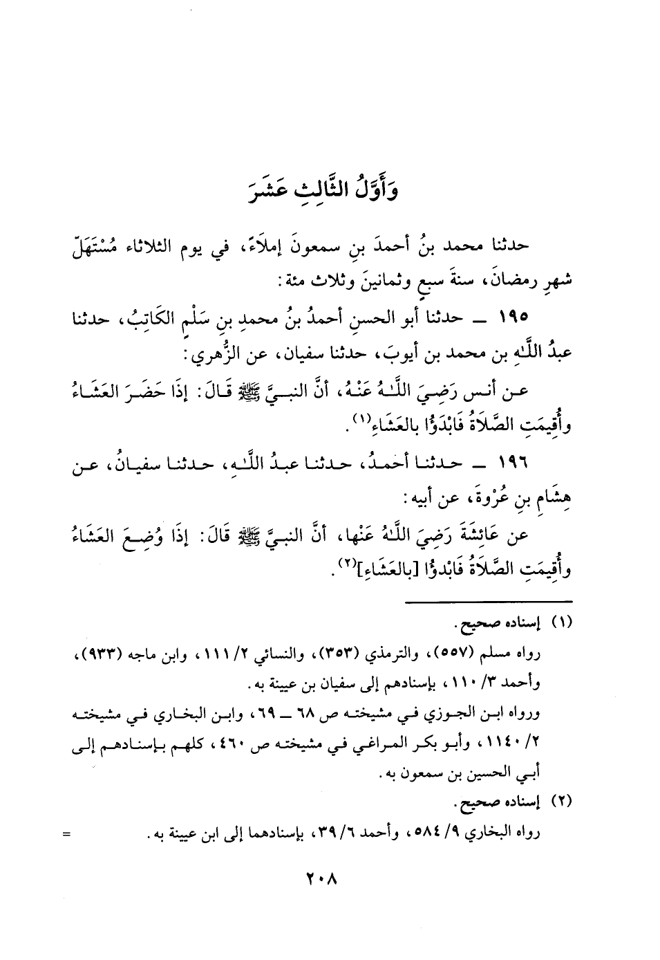 196 - حَدَّثَنَا أَحْمَدُ، حَدَّثَنَا عَبْدُ اللَّهِ، حَدَّثَنَا سُفْيَانُ، عَنْ هِشَامِ بْنِ عُرْوَةَ، عَنْ أَبِيهِ، عَنْ عِائَشَةَ، رَضِيَ اللَّهُ عَنْهَا، أَنّ النَّبِيَّ صَلَّى اللَّهُ عَلَيْهِ وَسَلَّمَ قَالَ: " إِذَا وُضِعَ الْعَشَاءُ وَأُقِيمَتِ الصَّلاةُ فَابْدَءُوا بِالْعَشَاءِ