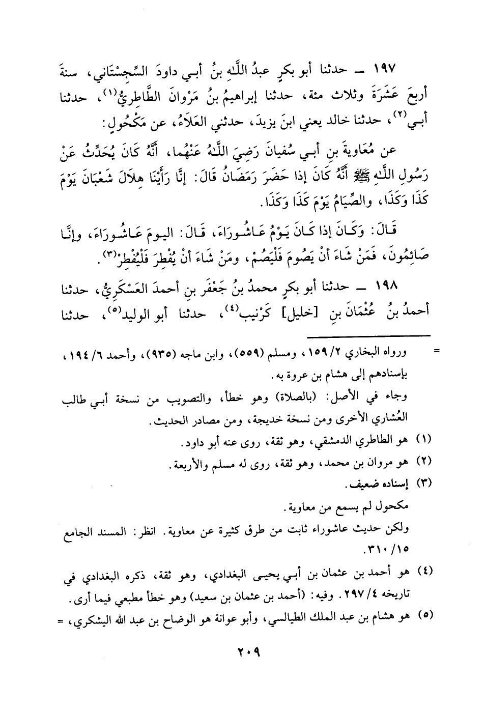 197 - حَدَّثَنَا أَبُو بَكْرٍ عَبْدُ اللَّهِ بْنُ أَبِي دَاوُدَ السِّجِسْتَانِيُّ، سَنَةَ أَرْبَعَ عَشْرَةَ وَثَلاثِ مِائَةٍ، حَدَّثَنَا إِبْرَاهِيمُ بْنُ مَرْوَانَ الطَّاطَرِيُّ، حَدَّثَنَا أبي، حَدَّثَنَا خَالِدٌ يَعْنِي ابْنَ يَزِيدَ، حَدَّثَنِي الْعَلاءُ، عَنْ مَكْحُولٍ، عَنْ مُعَاوِيَةَ بْنِ أَبِي سُفْيَانَ، رَضِيَ اللَّهُ عَنْهُمَا، أَنَّهُ كَانَ يُحَدِّثُ عَنْ رَسُولِ اللَّهِ صَلَّى اللَّهُ عَلَيْهِ وَسَلَّمَ، أَنَّهُ كَانَ إِذَا حَضَرَ رَمَضَانُ، قَالَ: «إِنَّا رَأَيْنَا هِلالَ شَعْبَانَ يَوْمَ كَذَا كَذَا، وَالصِّيَامُ يَوْمَ كَذَا وَكَذَا» ، قَالَ: وَكَانَ إِذَا كَانَ يَوْمُ عَاشُورَاءَ، قَالَ: " الْيَوْمُ عَاشُورَاءُ، وَإِنَّا صَائِمُونَ، فَمَنْ شَاءَ أَنْ يَصُومَ فَلْيَصُمْ، وَمَنْ شَاءَ أَنْ يُفْطِرَ فَلْيُفْطِرْ