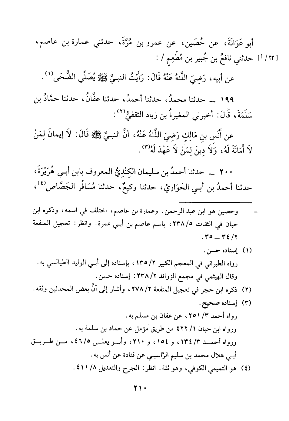 199 - حَدَّثَنَا مُحَمَّدٌ، حَدَّثَنَا أَحْمَدُ، حَدَّثَنَا عَفَّانُ، حَدَّثَنَا حَمَّادُ بْنُ سَلَمَةَ، قَالَ: أَخْبَرَنِي الْمُغِيرَةُ بْنُ زِيَادٍ الثَّقَفِيُّ، عَنْ أَنَسِ بْنِ مَالِكٍ، رَضِيَ اللَّهُ عَنْهُ، أَنّ النَّبِيَّ صَلَّى اللَّهُ عَلَيْهِ وَسَلَّمَ، قَالَ: " لا إِيمَانَ لِمَنْ لا أَمَانَةَ لَهُ، وَلا دِينَ لِمَنْ لا عَهْدَ لَهُ