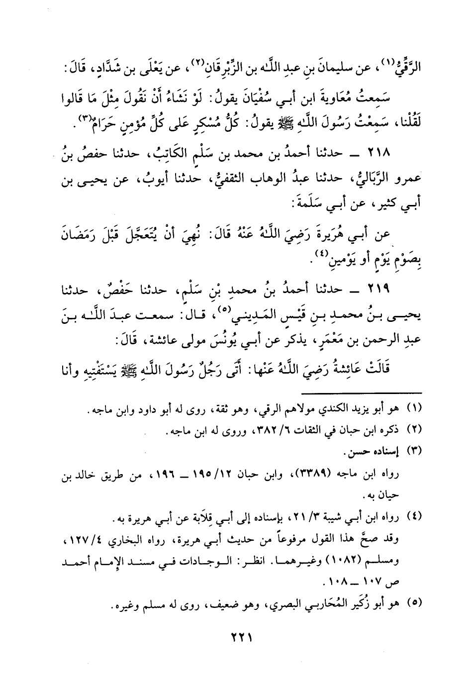 الرَّقِّيُّ، عَنْ سُلَيْمَانَ بْنِ عَبْدِ اللَّهِ بْنِ الزِّبْرِقَانِ، عَنْ يَعْلَى بْنِ شَدَّادٍ، قَالَ: سَمِعْتُ مُعَاوِيَةَ بْنَ أَبِي سُفْيَانَ، يَقُولُ: لَوْ نَشَاءُ أَنْ نَقُولَ مِثْلَ مَا قَالُوا: لَقُلْنَا: سَمِعْتُ رَسُولَ اللَّهِ صَلَّى اللَّهُ عَلَيْهِ وَسَلَّمَ، يَقُولُ: " كُلُّ مُسْكِرٍ عَلَى كُلِّ مُؤْمِنٍ حَرَامٌ