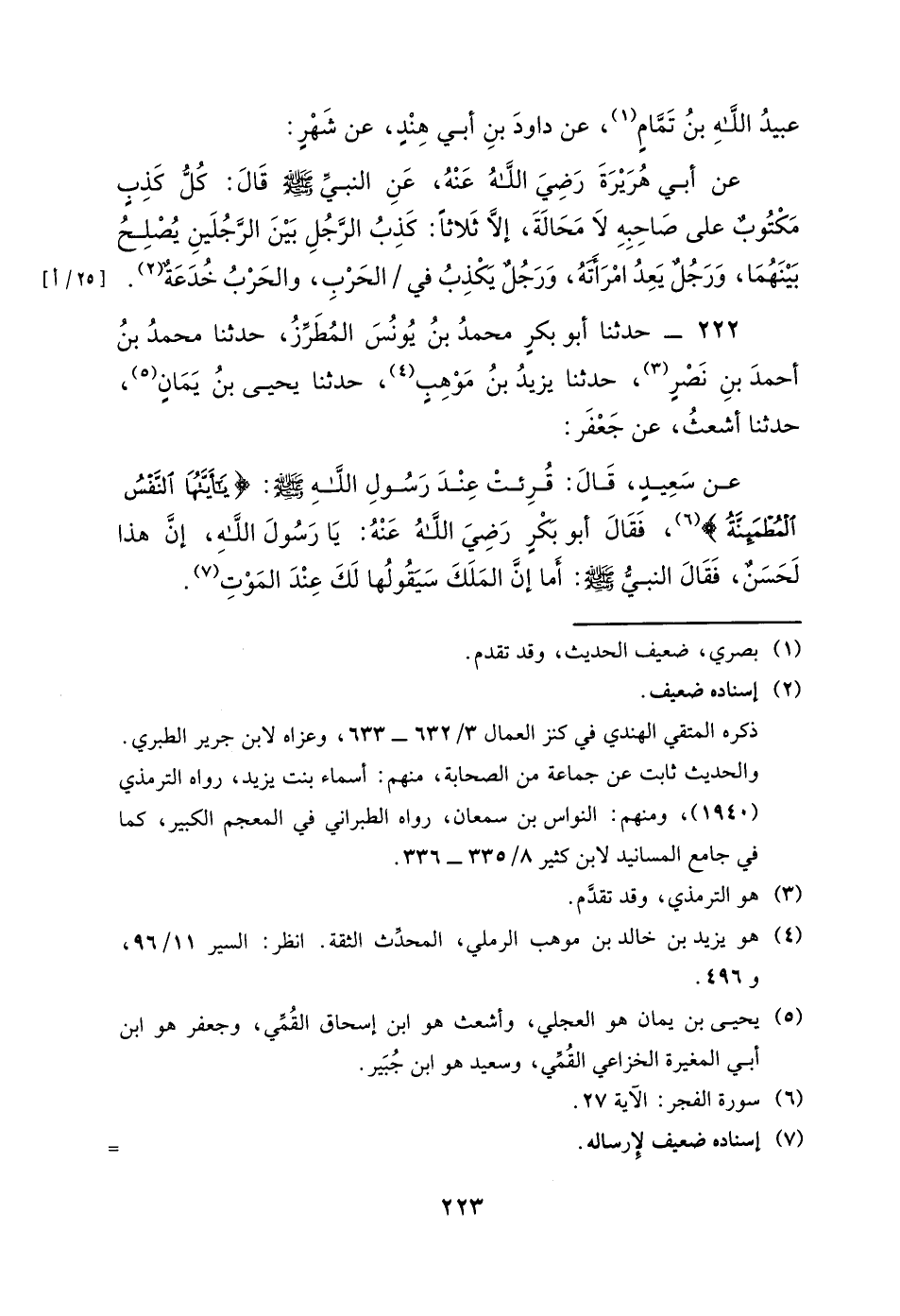 222 - حَدَّثَنَا أَبُو بَكْرٍ مُحَمَّدُ بْنُ يُونُسَ الْمُطَرَّزُ، حَدَّثَنَا مُحَمَّدُ بْنُ أَحْمَدَ بْنِ نَصْرٍ، حَدَّثَنَا يَزِيدُ بْنُ مَوْهِبٍ، حَدَّثَنَا يَحْيَى بْنُ يَمَانٍ، حَدَّثَنَا أَشْعَثُ، عَنْ جَعْفَرٍ، عَنْ سَعِيدٍ، قَالَ: قُرِئَتْ عِنْدَ رَسُولِ اللَّهِ صَلَّى اللَّهُ عَلَيْهِ وَسَلَّمَ: {يَأَيَّتُهَا النَّفْسُ الْمُطْمَئِنَّةُ} [الفجر: 27] فَقَالَ أَبُو بَكْرٍ رَضِيَ اللَّهُ عَنْهُ: يَا رَسُولَ اللَّهِ، إِنَّ هَذَا لَحَسَنٌ، فَقَالَ النَّبِيُّ صَلَّى اللَّهُ عَلَيْهِ وَسَلَّمَ: " أَمَا إِنَّ الْمَلَكَ سَيَقُولُهَا لَكَ عِنْدَ الْمَوْتِ