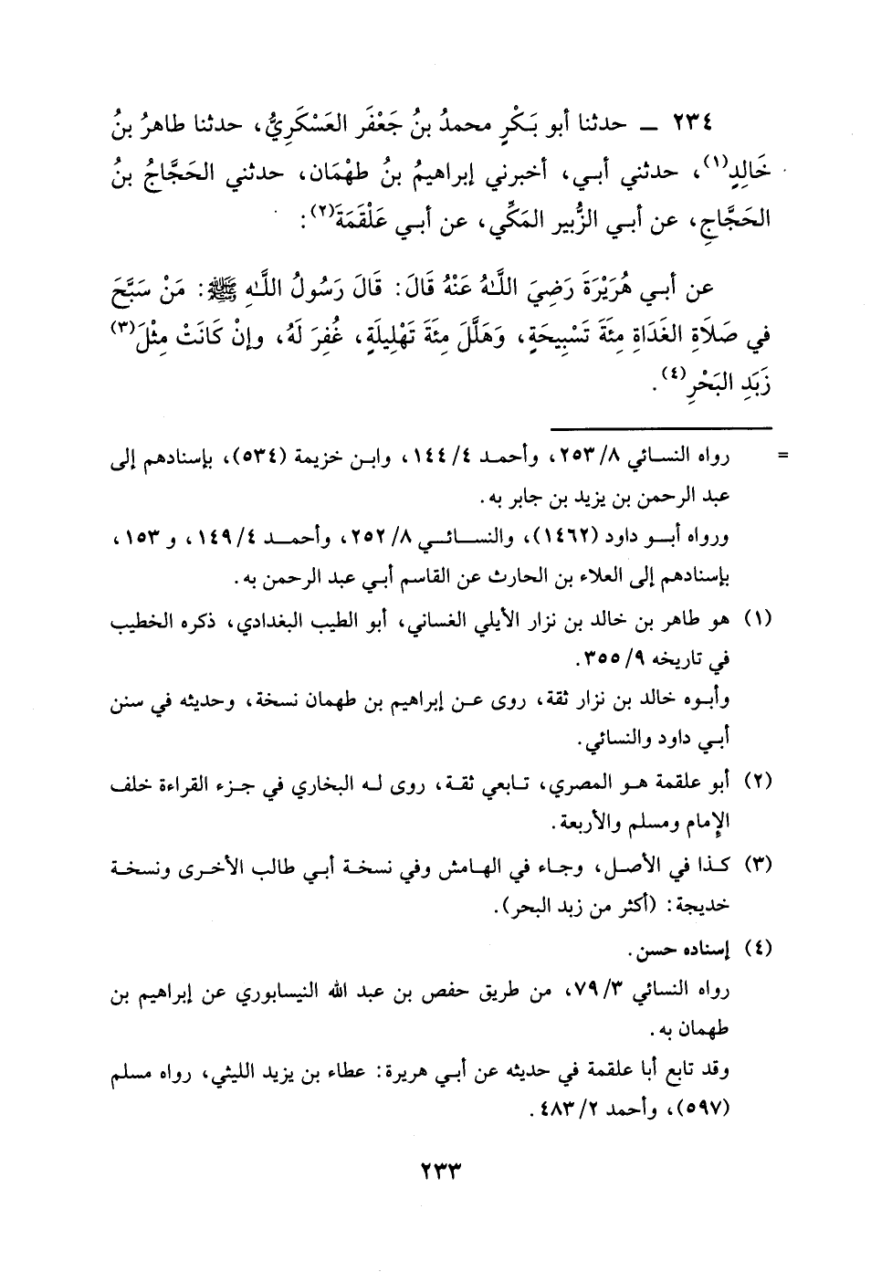 234 - حَدَّثَنَا أَبُو بَكْرٍ مُحَمَّدُ بْنُ جَعْفَرٍ الْعَسْكَرِيُّ، حَدَّثَنَا طَاهِرُ بْنُ خَالِدٍ، حَدَّثَنِي أَبِي، أَخْبَرَنِي إِبْرَاهِيمُ بْنُ طَهْمَانَ، حَدَّثَنِي الْحَجَّاجُ بْنُ الْحَجَّاجِ، عَنْ أَبِي الزُّبَيْرِ الْمَكِّيِّ، عَنْ أَبِي عَلْقَمَةَ، عَنْ أَبِي هُرَيْرَةَ، رَضِيَ اللَّهُ عَنْهُ، قَالَ: قَالَ رَسُولُ اللَّهِ صَلَّى اللَّهُ عَلَيْهِ وَسَلَّمَ: " مَنْ سَبَّحَ فِي صَلاةِ الْغَدَاةِ مِئَةَ تَسْبِيحَةٍ، وَهَلَّلَ مِئَةَ تَهْلِيلَةٍ، غُفِرَ لَهُ، وَإِنْ كَانَتْ مِثْلَ زَبَدِ الْبَحْرِ