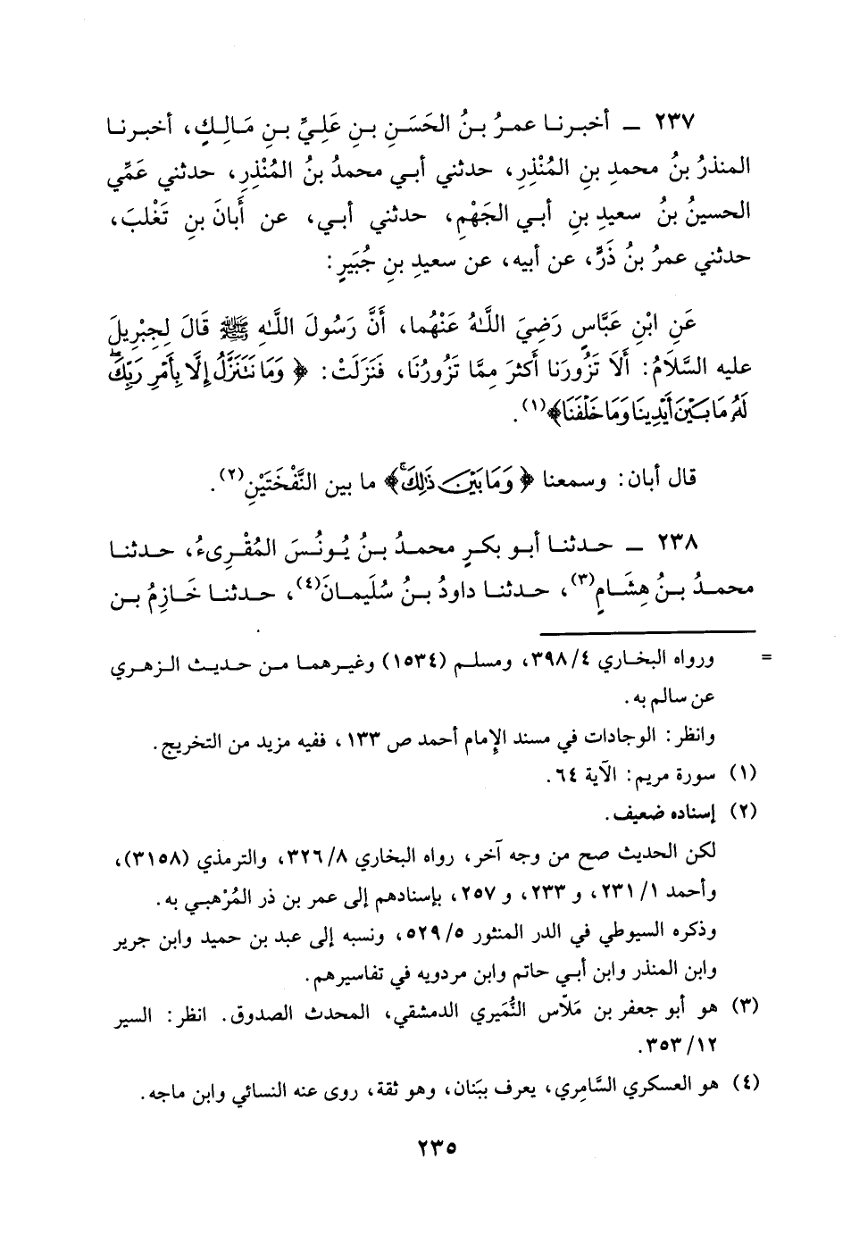 237 - أَخْبَرَنَا عُمَرُ بْنُ الْحَسَنِ بْنِ عَلِيِّ بْنِ مَالِكٍ، أَخْبَرَنَا الْمُنْذِرُ بْنُ مُحَمَّدِ بْنِ الْمُنْذِرِ، حَدَّثَنِي أَبِي مُحَمَّدِ بْنِ الْمُنْذِرِ، حَدَّثَنِي عَمِّي الْحُسَيْنُ بْنُ سَعِيدُ بْنُ أَبِي الْجَهْمِ، حَدَّثَنِي أَبِي، عَنْ أَبَانِ بْنِ تَغْلِبَ، حَدَّثَنِي عُمَرُ بْنُ ذَرٍّ، عَنْ أَبِيهِ، عَنْ سَعِيدِ بْنِ جُبَيْرٍ، عَنِ ابْنِ عَبَّاسٍ، رَضِيَ اللَّهُ عَنْهُمَا، أَنَّ رَسُولَ اللَّهِ صَلَّى اللَّهُ عَلَيْهِ وَسَلَّمَ، قَالَ لِجِبْرِيلَ عَلَيْهِ السَّلامُ: " أَلا تَزُورُنَا أَكْثَرَ مِمَّا تَزُورُنَا، فَنَزَلَتْ: {وَمَا نَتَنَزَّلُ إِلا بِأَمْرِ رَبِّكَ لَهُ مَا بَيْنَ أَيْدِينَا وَمَا خَلْفَنَا} [مريم: 64] ".