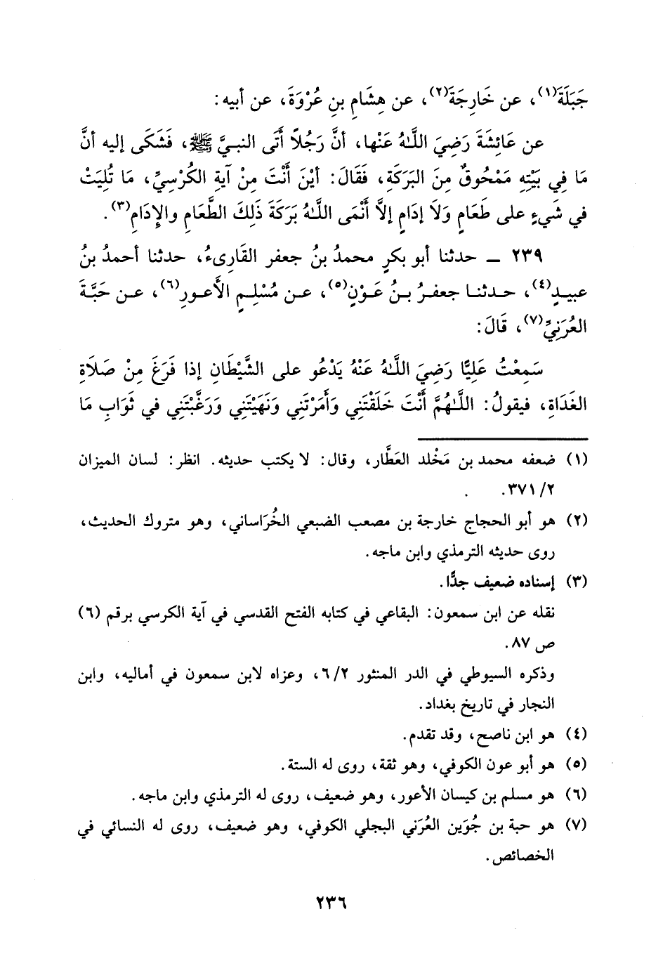239 - حَدَّثَنَا أَبُو بَكْرٍ مُحَمَّدُ بْنُ جَعْفَرٍ الْقَارِئُ، حَدَّثَنَا أَحْمَدُ بْنُ عُبَيْدٍ، حَدَّثَنَا جَعْفَرُ بْنُ عَوْنٍ، عَنْ مُسْلِمٍ الأَعْوَرِ، عَنْ حَبَّةَ الْعُرَنِيِّ، قَالَ: سَمِعْتُ عَلِيًّا رَضِيَ اللَّهُ عَنْهُ يَدْعُو عَلَى الشَّيْطَانِ، إِذَا فَرَغَ مِنْ صَلاةِ الْغَدَاةِ، فَيَقُولُ: " اللَّهُمَّ أَنْتَ خَلَقْتَنِي وَأَمَرْتَنِي وَنَهَيْتَنِي وَرَغَّبْتَنِي فِي ثَوَابِ مَا
