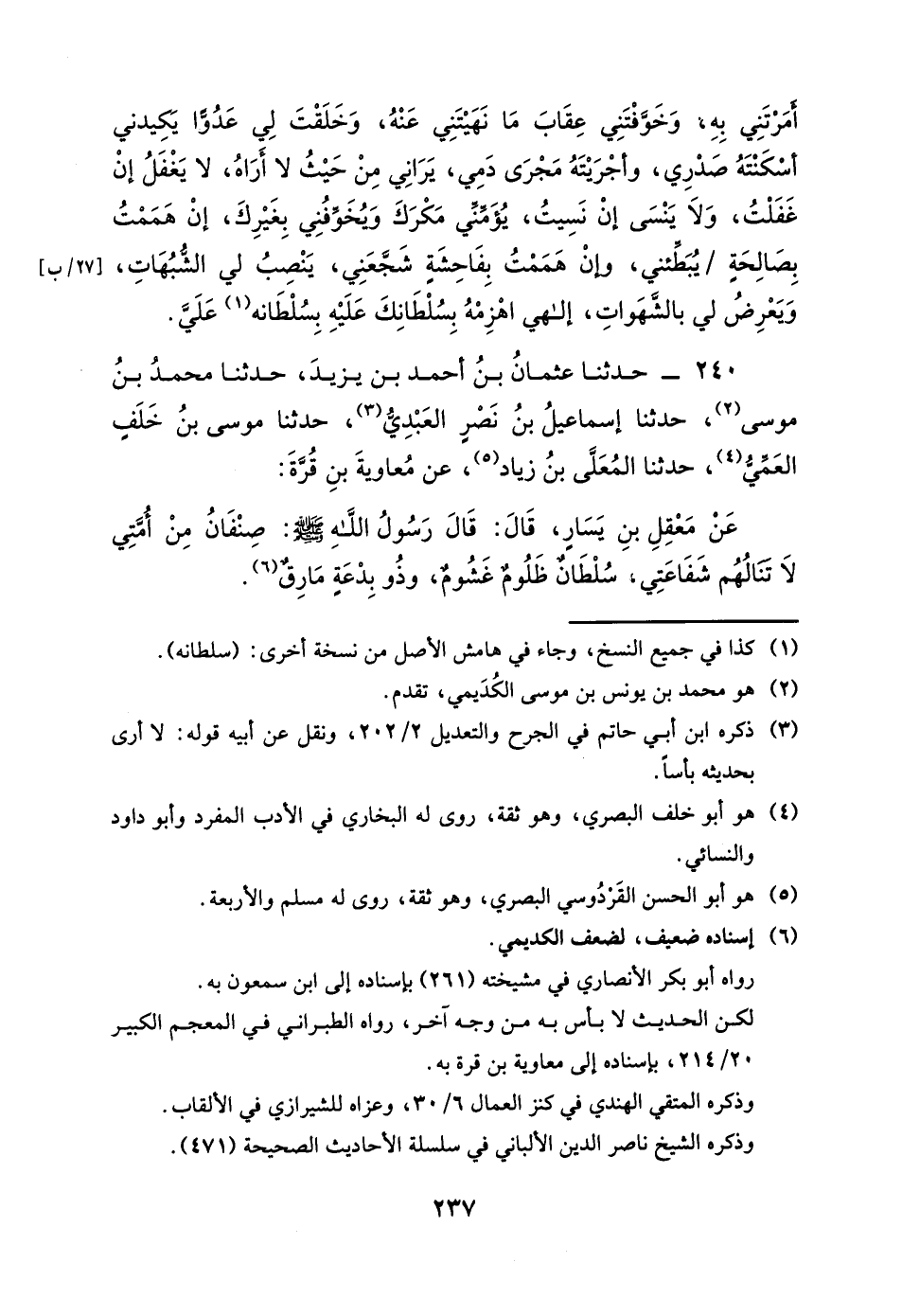 240 - حَدَّثَنَا عُثْمَانُ بْنُ أَحْمَدَ بْنِ يَزِيدَ، حَدَّثَنَا مُحَمَّدُ بْنُ مُوسَى، حَدَّثَنَا إِسْمَاعِيلُ بْنُ نَصْرٍ الْعَبْدِيُّ، حَدَّثَنَا مُوسَى بْنُ خَلَفٍ الْعَمِّيُّ، حَدَّثَنَا الْمُعَلَّى بْنُ زِيَادٍ، عَنْ مُعَاوِيَةَ بْنِ قُرَّةَ، عَنْ مَعْقِلِ بْنِ يَسَارٍ، قَالَ: قَالَ رَسُولُ اللَّهِ صَلَّى اللَّهُ عَلَيْهِ وَسَلَّمَ: " صِنْفَانِ مِنْ أُمَّتِي لا تَنَالُهُمْ شَفَاعَتِي: سُلْطَانٌ ظَلُومٌ غَشُومٌ، وَذُو بِدْعَةٍ مَارِقٌ