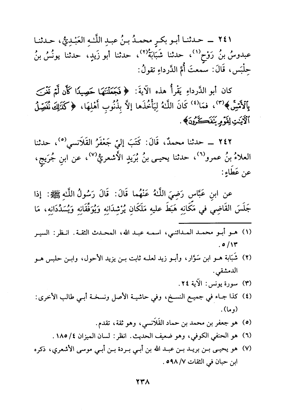 241 - حَدَّثَنَا أَبُو بَكْرٍ مُحَمَّدُ بْنُ عَبْدِ اللَّهِ الْعَبْدِيُّ، حَدَّثَنَا عُبْدُوسُ بْنُ رَوْحٍ، حَدَّثَنَا شَبَابَةُ، حَدَّثَنَا أَبُو زَيْدٍ، حَدَّثَنَا يُونُسُ بْنُ حَلْبَسَ، قَالَ: سَمِعْتُ أُمَّ الدَّرْدَاءِ تَقُولُ: كَانَ أَبُو الدَّرْدَاءُ، يَقْرَأُ هَذِهِ الآيَةَ: {فَجَعَلْنَاهَا حَصِيدًا كَأَنْ لَمْ تَغْنَ بِالأَمْسِ} [يونس: 24] ، فَمَا كَانَ اللَّهُ لِيَأْخُذَهَا إِلا بِذُنُوبِ أَهْلِهَا {كَذَلِكَ نُفَصِّلُ الآيَاتِ لِقَوْمٍ يَتَفَكَّرُونَ} [يونس: 24]