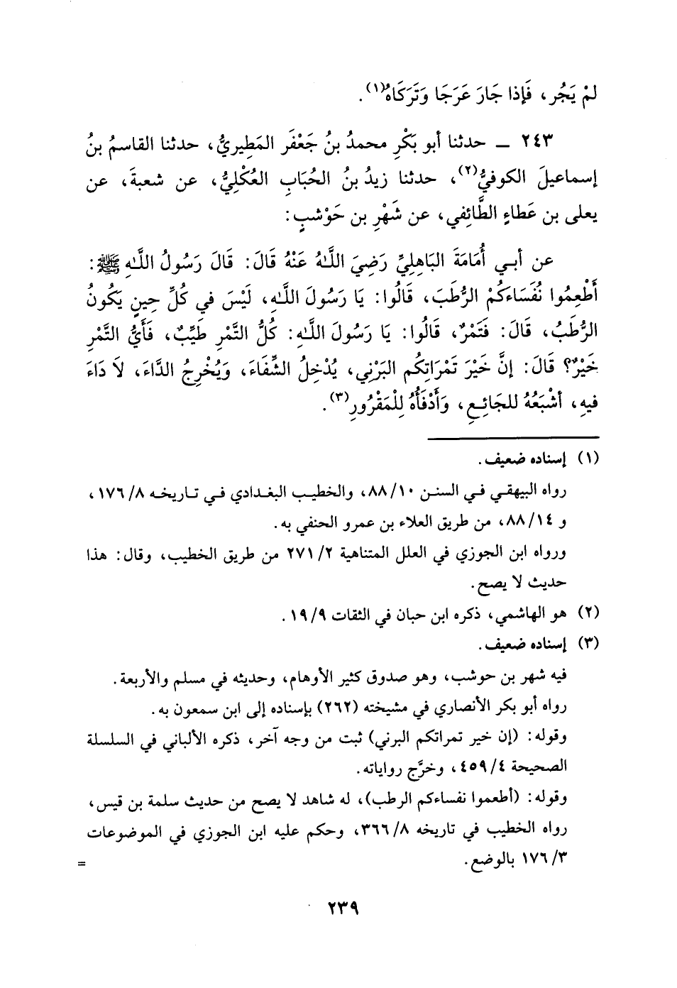 243 - حَدَّثَنَا أَبُو بَكْرٍ مُحَمَّدُ بْنُ جَعْفَرٍ الْمَطِيرِيُّ، حَدَّثَنَا الْقَاسِمُ بْنُ إِسْمَاعِيلَ الْكُوفِيُّ، حَدَّثَنَا زَيْدُ بْنُ الْحُبَابِ الْعُكْلِيُّ، عَنْ شُعْبَةَ، عَنْ يَعْلَى بْنِ عَطَاءٍ الطَّائِفِيِّ، عَنْ شَهْرِ بْنِ حَوْشَبٍ، عَنْ أَبِي أُمَامَةَ الْبَاهِلِيُّ، رَضِيَ اللَّهُ عَنْهُ، قَالَ: قَالَ رَسُولُ اللَّهِ صَلَّى اللَّهُ عَلَيْهِ وَسَلَّمَ: «أَطْعِمُوا نُفَسَاءَكُمُ الرُّطَبَ» ، قَالُوا: يَا رَسُولَ اللَّهِ، لَيْسَ فِي كُلِّ حِينٍ يَكُونُ الرُّطَبُ، قَالَ: «فَتَمْرٌ» ، قَالُوا: يَا رَسُولَ اللَّهِ، كُلُّ التَّمْرِ طَيِّبٌ، فَأَيُّ التَّمْرِ خَيْرٌ؟ قَالَ: " إِنَّ خَيْرَ تَمَرَاتِكُمْ الْبَرْنِيُّ، يُدْخِلُ الشِّفَاءَ، وَيُخْرِجُ الدَّاءَ، لا دَاءَ فِيهِ، أَشْبَعُهُ لِلْجَائِعِ، وَأَدْفَأُهُ لِلْمَقْرُورِ