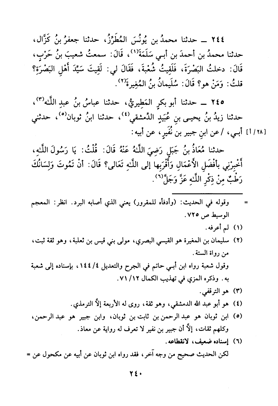 245 - حَدَّثَنَا أَبُو بَكْرٍ الْمَطِيرِيُّ، حَدَّثَنَا عَبَّاسُ بْنُ عَبْدِ اللَّهِ، حَدَّثَنَا زَيْدُ بْنُ يَحْيَى بْنِ عُبَيْدٍ الدِّمَشْقِيُّ، حَدَّثَنَا ابْنُ ثَوْبَانَ، حَدَّثَنِي أَبِي، عَنِ ابْنِ جُبَيْرِ بْنِ نُفَيْرٍ، عَنْ أَبِيهِ، حَدَّثَنَا مُعَاذُ بْنُ جَبَلٍ، رَضِيَ اللَّهُ عَنْهُ، قَالَ: قُلْتُ: يَا رَسُولَ اللَّهِ، أَخْبِرْنِي بِأَفْضَلِ الأَعْمَالِ وَأَقْرَبِهَا إِلَى اللَّهِ تَعَالَى؟ قَالَ: " أَنْ تَمُوتَ وَلِسَانُكَ رَطْبٌ مِنْ ذِكْرِ اللَّهِ عَزَّ وَجَلَّ