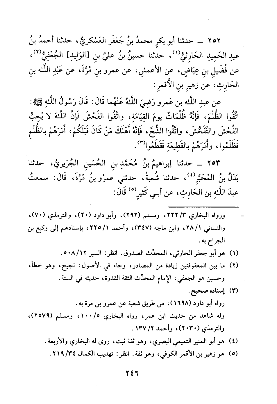 252 - حَدَّثَنَا أَبُو بَكْرٍ مُحَمَّدُ بْنُ جَعْفَرٍ الْعَسْكَرِيُّ، حَدَّثَنَا أَحْمَدُ بْنُ عَبْدِ الْحَمِيدِ الْحَارِثِيُّ، حَدَّثَنَا حُسَيْنُ بْنُ عَلِيِّ بْنِ الْوَلِيدِ الْجُعْفِيُّ، عَنْ فُضَيْلِ بْنِ عِيَاضٍ، عَنِ الأَعْمَشِ، عَنْ عَمْرِو بْنِ مُرَّةَ، عَنْ عَبْدِ اللَّهِ بْنِ الْحَارِثِ، عَنْ زُهَيْرِ بْنِ الأَقْمَرِ، عَنْ عَبْدِ اللَّهِ بْنِ عَمْرٍو، رَضِيَ اللَّهُ عَنْهُمَا، قَالَ: قَالَ رَسُولُ اللَّهِ صَلَّى اللَّهُ عَلَيْهِ وَسَلَّمَ: «اتَّقُوا الظُّلْمَ، فَإِنَّهُ ظُلُمَاتٌ يَوْمَ الْقِيَامَةِ، وَاتَّقُوا الْفُحْشَ فَإِنَّ اللَّهَ لا يُحِبُّ الْفُحْشَ وَالتَّفَحُّشَ، وَاتَّقُوا الشُّحَّ، فَإِنَّهُ أَهْلَكَ مَنْ كَانَ قَبْلَكُمْ، أَمَرَهُمْ بِالظُّلْمِ فَظَلَمُوا، وَأَمَرَهُمْ بِالْقَطِيعَةِ فَقَطَعُوا» .