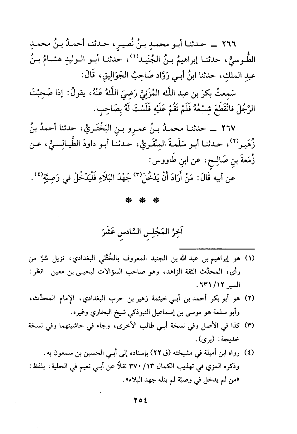 266 - حَدَّثَنَا أَبُو مُحَمَّدِ بْنُ نُصَيْرٍ، حَدَّثَنَا أَحْمَدُ بْنُ مُحَمَّدٍ الطُّوسِيُّ، حَدَّثَنَا إِبْرَاهِيمُ بْنُ الْجُنَيْدِ، حَدَّثَنَا أَبُو الْوَلِيدِ هِشَامُ بْنُ عَبْدِ الْمَلِكِ، حَدَّثَنَا ابْنُ أَبِي دَاوُدَ صَاحِبُ الْجَوَالِيقِ، قَالَ: سَمِعْتُ بَكْرَ بْنَ عَبْدِ اللَّهِ الْمُزَنِيَّ، رَضِيَ اللَّهُ عَنْهُ، يَقُولُ: " إِذَا صَحِبْتَ الرَّجُلَ فَانْقَطَعَ شَسَعُهُ، فَلَمْ تَقُمْ عَلَيْهِ فَلَسْتَ لَهُ بِصَاحِبٍ