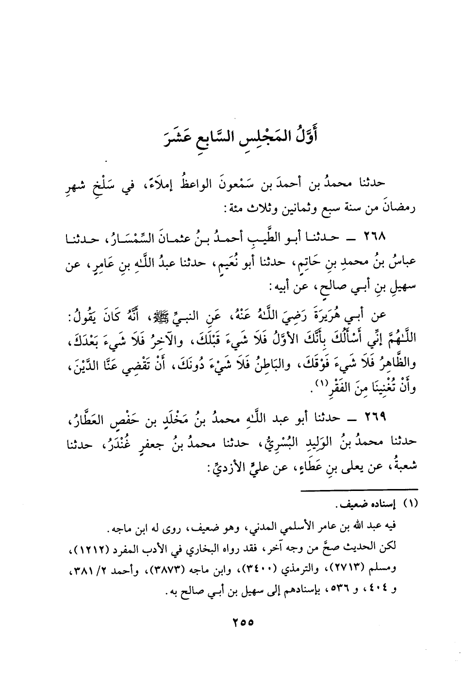 268 - حَدَّثَنَا أَبُو الطَّيِّبِ أَحْمَدُ بْنُ عُثْمَانَ السِّمْسَارُ، حَدَّثَنَا عَبَّاسُ بْنُ مُحَمَّدِ بْنِ حَاتِمٍ، حَدَّثَنَا أَبُو نُعَيْمٍ، حَدَّثَنَا عَبْدُ اللَّهِ بْنُ عَامِرٍ، عَنْ سُهَيْلِ بْنِ أَبِي صَالِحٍ، عَنْ أَبِيهِ، عَنْ أَبِي هُرَيْرَةَ، رَضِيَ اللَّهُ عَنْهُ، عَنِ النَّبِيِّ صَلَّى اللَّهُ عَلَيْهِ وَسَلَّمَ أَنَّهُ كَانَ يَقُولُ: " اللَّهُمَّ إِنِّي أَسْأَلُكَ بِأَنَّكَ الأَوَّلُ فَلا شَيْءَ قَبْلَكَ، وَالآخِرُ فَلا شَيْءَ بَعْدَكَ، وَالظَّاهِرُ فَلا شَيْءَ فَوْقَكَ، وَالْبَاطِنُ فَلا شَيْءَ دُونَكَ، أَنْ تَقْضِيَ عَنَّا الدَّيْنَ، وَأَنْ تُغْنِيَنَا مِنَ الْفَقْرِ