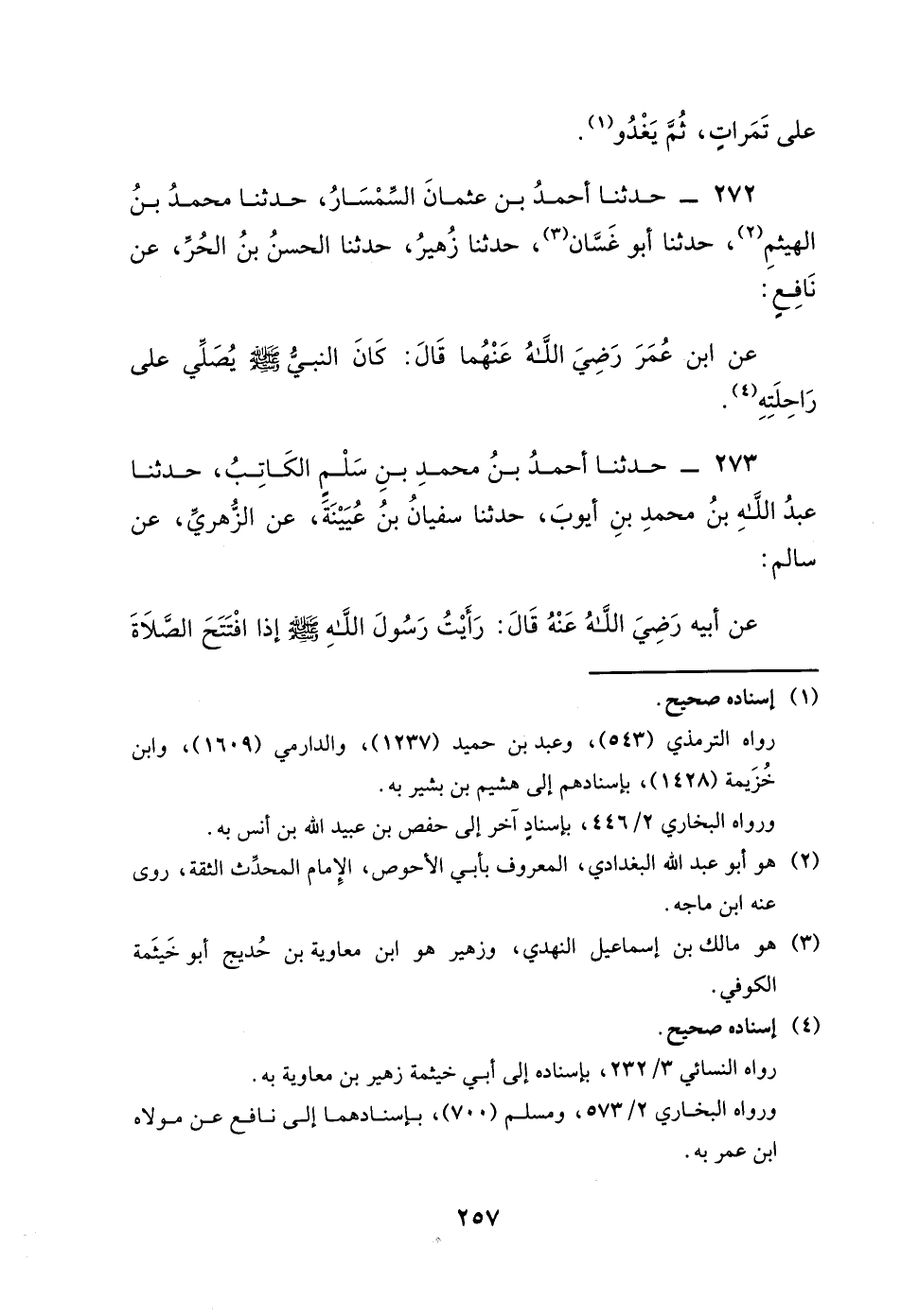 272 - حَدَّثَنَا أَحْمَدُ بْنُ عُثْمَانَ السِّمْسَارُ، حَدَّثَنَا مُحَمَّدُ بْنُ الْهَيْثَمِ، حَدَّثَنَا أَبُو غَسَّانَ، حَدَّثَنَا زُهَيْرٌ، حَدَّثَنَا الْحَسَنُ بْنُ الْحُرِّ، عَنْ نَافِعٍ، عَنِ ابْنِ عُمَرَ، رَضِيَ اللَّهُ عَنْهُمَا، قَالَ: " كَانَ النَّبِيُّ صَلَّى اللَّهُ عَلَيْهِ وَسَلَّمَ يُصَلِّي عَلَى رَاحِلَتِهِ