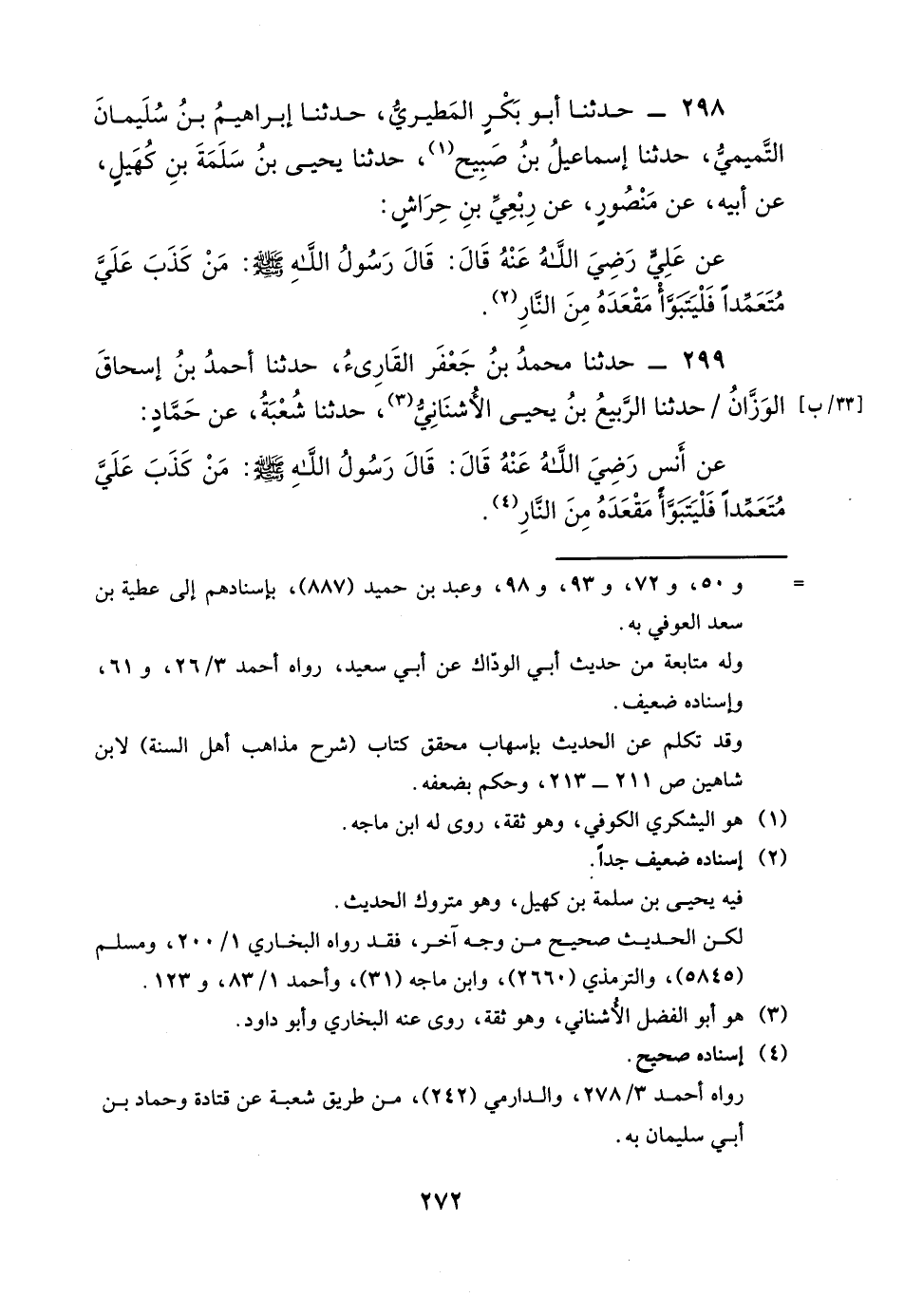 298 - حَدَّثَنَا أَبُو بَكْرٍ الْمَطِيرِيُّ، حَدَّثَنَا إِبْرَاهِيمُ بْنُ سُلَيْمَانَ التَّمِيمِيُّ، حَدَّثَنَا إِسْمَاعِيلُ بْنُ صَبِيحٍ، حَدَّثَنَا يَحْيَى بْنُ سَلَمَةَ بْنِ كُهَيْلٍ، عَنْ أَبِيهِ، عَنْ مَنْصُورٍ، عَنْ رِبعِيِّ بْنِ حِرَاشٍ، عَنْ عَلِيٍّ، رَضِيَ اللَّهُ عَنْهُ، قَالَ: قَالَ رَسُولُ اللَّهِ صَلَّى اللَّهُ عَلَيْهِ وَسَلَّمَ: " مَنْ كَذَبَ عَلَيَّ مُتَعَمِّدًا فَلْيَتَبَوَّأْ مَقْعَدَهُ مِنَ النَّارِ