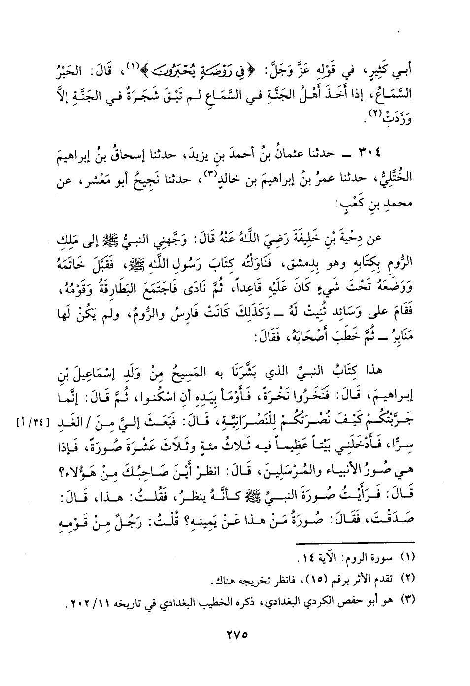 304 - حَدَّثَنَا عُثْمَانُ بْنُ أَحْمَدَ يَزِيدُ، حَدَّثَنَا إِسْحَاقُ بْنُ إِبْرَاهِيمَ الْخُتُلِّيُّ، حَدَّثَنَا عُمَرُ بْنُ إِبْرَاهِيمَ بْنِ خَالِدٍ، حَدَّثَنَا نَجِيحٌ أَبُو مَعْشَرٍ، عَنْ مُحَمَّدِ بْنِ كَعْبٍ، عَنْ دَحْيَةَ بْنِ خَلِيفَةَ، رَضِيَ اللَّهُ عَنْهُ، قَالَ: " وَجَّهَنِي النَّبِيُّ صَلَّى اللَّهُ عَلَيْهِ وَسَلَّمَ إِلَى مَلِكِ الرُّومِ بِكِتَابِهِ وَهُوَ بِدِمَشْقَ، فَنَاوَلْتُهُ كِتَابَ رَسُولِ اللَّهِ صَلَّى اللَّهُ عَلَيْهِ وَسَلَّمَ، فَقَبَّلَ خَاتَمَهُ، وَوَضَعَهُ تَحْتَ شَيْءٍ كَانَ عَلَيْهِ قَاعِدًا، ثُمَّ نَادَى فَاجْتَمَعَ الْبَطَارِقَةُ وَقَوْمُهُ، فَقَامَ عَلَى وَسَائِدَ ثُنِيَتْ لَهُ، وَكَذَلِكَ كَانَتْ فَارِسُ وَالرُّومُ وَلَمْ يَكُنْ لَهُ مَنَابِرَ، ثُمَّ خَطَبَ أَصْحَابَهُ، فَقَالَ: هَذَا كِتَابُ النَّبِيِّ الَّذِي بَشَّرَنَا بِهِ الْمَسِيحُ مِنْ وَلَدِ إِسْمَاعِيلَ بْنِ إِبْرَاهِيمَ، قَالَ: فَنَخَرُوا نَخْرَةً فَأَوْمَأَ بِيَدِهِ أَنِ اسْكُنُوا، ثُمَّ قَالَ: إِنَّمَا جَرَّبْتُكُمْ كَيْفَ نُصْرَتُكُمْ لِلنَّصْرَانِيَّةِ، قَالَ: فَبَعَثَ إِلَيَّ مِنَ الْغَدِ سِرًّا، فَأَدْخَلَنِي بَيْتًا عَظِيمًا فِيهِ ثَلاثُ مِئَةٍ وَثَلاثَةَ عَشْرَةَ صُورَةً، فَإِذَا هِيَ صُوَرُ الأَنْبِيَاءِ وَالْمُرْسَلِينَ، قَالَ: انْظُرْ أَيْنَ صَاحِبُكَ مِنْ هَؤُلاءِ؟ قَالَ: فَرَأَيْتُ صُورَةَ النَّبِيِّ صَلَّى اللَّهُ عَلَيْهِ وَسَلَّمَ كَأَنَّهُ يَنْظُرُ، فَقُلْتُ: هَذَا، قَالَ: صَدَقْتَ، فَقَالَ: صُورَةُ مَنْ هَذَا عَنْ يَمِينِهِ؟ قُلْتُ: رَجُلٌ مِنْ قَوْمِهِ،