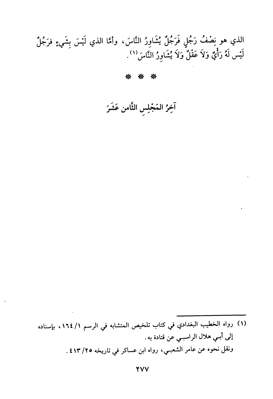 الَّذِي هُوَ نِصْفُ رَجُلٍ فَرَجُلٌ يُشَاوِرُ النَّاسَ، وَأَمَّا الَّذِي لَيْسَ بِشَيْءٍ، فَرَجُلٌ لَيْسَ لَهُ رَأْيٌ وَلا عَقْلَ، وَلا يُشَاوِرُ النَّاسُ