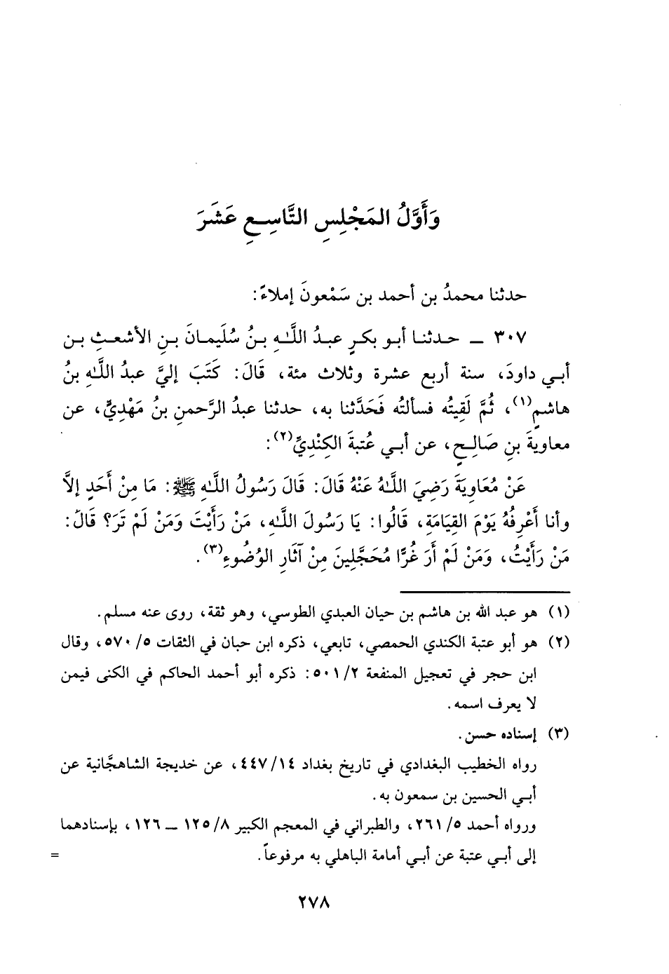 307 - حَدَّثَنَا أَبُو بَكْرٍ عَبْدُ اللَّهِ بْنُ سُلَيْمَانَ بْنِ الأَشْعَثِ ابْنُ أَبِي دَاوُدَ، سَنَةَ أَرْبَعَ عَشْرَةَ وَثَلاثِ مِئَةٍ، قَالَ: كَتَبَ إِلَيَّ عَبْدُ اللَّهِ بْنُ هَاشِمٍ ثُمَّ لَقِيتُهُ فَسَأَلْتُهُ فَحَدَّثَنَا بِهِ، حَدَّثَنَا عَبْدُ الرَّحْمَنِ بْنُ مَهْدِيٍّ، عَنْ مُعَاوِيَةَ بْنِ صَالِحٍ، عَنْ أَبِي عُتْبَةَ الْكِنْدِيِّ، عَنْ مُعَاوِيَةَ، رَضِيَ اللَّهُ عَنْهُ، قَالَ: قَالَ رَسُولُ اللَّهِ صَلَّى اللَّهُ عَلَيْهِ وَسَلَّمَ: " مَا مِنْ أَحَدٍ إِلا وَأَنَا أَعْرِفُهُ يَوْمَ الْقِيَامَةِ، قَالُوا: يَا رَسُولَ اللَّهِ، مَنْ رَأَيْتَ وَمَنْ لَمْ تَرَ؟ قَالَ: مَنْ رَأَيْتُ وَمَنْ لَمْ أَرَ غُرًّا مُحَجَّلِينَ مِنْ آثَارِ الْوُضُوءِ