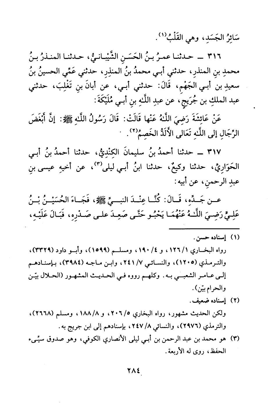 317 - حَدَّثَنَا أَحْمَدُ بْنُ سُلَيْمَانَ الْكِنْدِيُّ، حَدَّثَنَا أَحْمَدُ بْنُ أَبِي الْحَوَارِيِّ، حَدَّثَنَا وَكِيعٌ، حَدَّثَنَا ابْنُ أَبِي لَيْلَى، عَنْ أَخِيهِ عِيسَى بْنِ عَبْدِ الرَّحْمَنِ، عَنْ أَبِيهِ، عَنْ جَدِّهِ، قَالَ: كُنَّا عِنْدَ النَّبِيِّ صَلَّى اللَّهُ عَلَيْهِ وَسَلَّمَ فَجَاءَ الْحُسَيْنُ بْنُ عَلِيٍّ رَضِيَ اللَّهُ عَنْهُمَا، يَحْبُو حَتَّى صَعَدَ عَلَى صَدْرِهِ، فَبَالَ عَلَيْهِ،