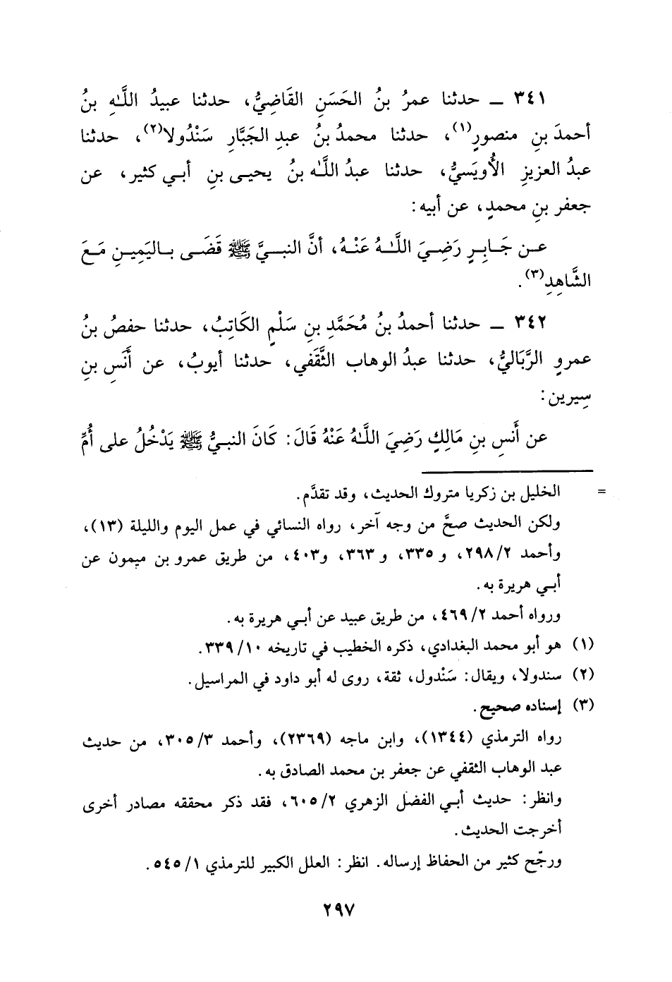 341 - حَدَّثَنَا عُمَرُ بْنُ الْحَسَنِ الْقَاضِي، حَدَّثَنَا عُبَيْدُ اللَّهِ بْنُ أَحْمَدَ بْنِ مَنْصُورٍ، حَدَّثَنَا مُحَمَّدُ بْنُ عَبْدِ الْجَبَّارِ سندولا، حَدَّثَنَا عَبْدُ الْعَزِيزِ الأُوَيْسِيُّ، حَدَّثَنَا عَبْدُ اللَّهِ بْنُ يَحْيَى بْنِ أَبِي كَثِيرٍ، عَنْ جَعْفَرِ بْنِ مُحَمَّدٍ، عَنْ أَبِيهِ، عَنْ جَابِرٍ رَضِيَ اللَّهُ عَنْهُ، أَنّ النَّبِيَّ صَلَّى اللَّهُ عَلَيْهِ وَسَلَّمَ " قَضَى بِالْيَمِينِ مَعَ الشَّاهِدِ