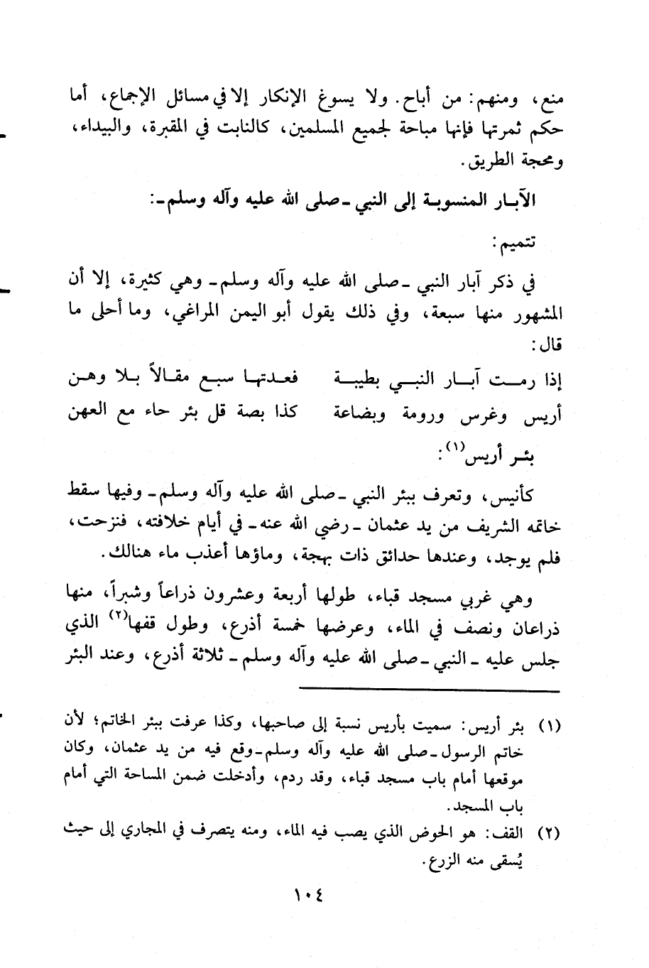 ... ويُروى أنه عليه وعلى آله الصلاة والسلام: قصر الصلاة في الغابة، وإليها تنتهي عين معاوية ولم يبق منها اليوم غير مجاريها. وعلى ذكر صوت العباس قال: في القاموس: أبو عروة: رجل، كان يصيح بالأسد، فيموت، فيشق بطنه، فيجد قلبه قد زال عن موضعه. وللطبراني في ((الكبير)): سيبلغ البنيان سلعاً ثم يأتي على المدينة زمان يمر السفر على بعض أقطارها، فتقول: قد كانت مرة عامرة، وذلك من طول الزمان، وعفو الأثر.