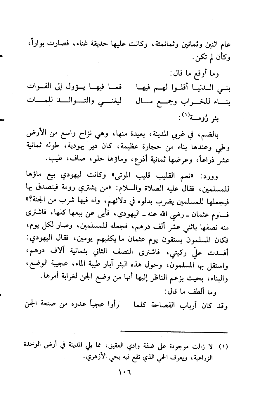 وفي غربي المسجد الثالث صهريج يمتلىء من سيل أبي جيدة وعليه إيوان لطيف، يقال: إنه من عمارة إبراهيم آغا، وفي غربي الصهريج حديقة لطيفة، وسبيل عُمر في سنة ثمان وأربعين وألف، وخلفه إلى جانب المغرب حدائق، وبساتين ومزارع وفي شرقي سلع، حول مناخ الركب الشامي حدائق ذات بهجة من أحسنها الزكي، وهي حديقة ذات نضارة، وعمارة، وهي عند مشهد السيد محمد الزكي وبه عرفت، وهي في قبلة ثنية الوداع. وعلى ذكر الثنية فما أحسن ما قال: