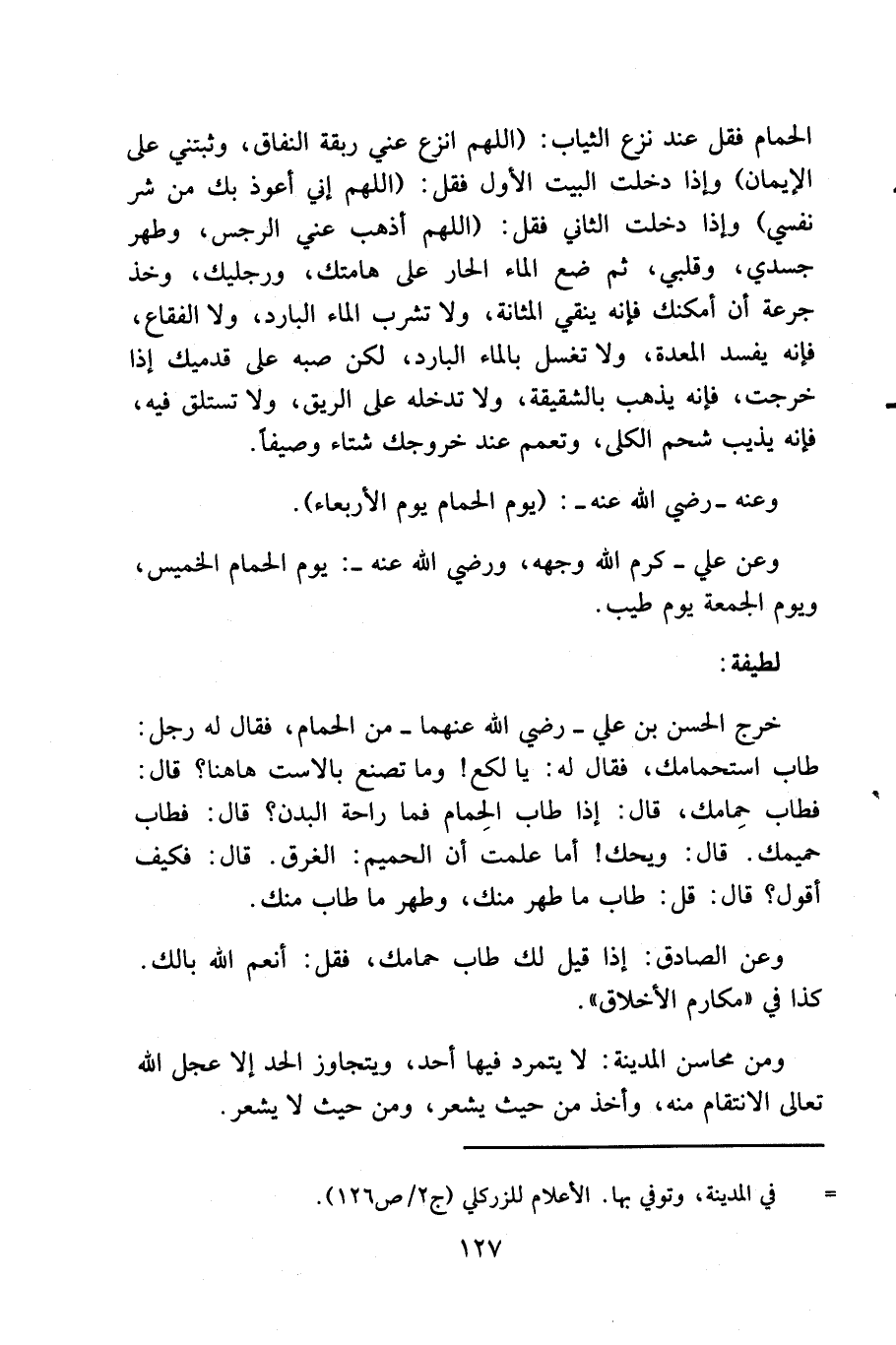 ... وللماء الصحيح لذة، ودخل في تدبير الصحة إذا استعمل بشروطه، وهي: ألا يؤخذ قبل الهضم، فإنه مفسد للأغذية، ومبرد للمعدة، ومصعد للأبخرة، وألا يستعمل الفاسد منه بلا مصلح، كأكل البصل قبله، أو بعده، ومزجه بالخل، وأن يكون بداعية صادقة، فما شُرب قبل خمس عشرة درجة تمضي من الأكل لصفراوي، وضعفها لدموي، وخمسة وأربعين لسوادي، وستين لبلغمي كاذب لا اعتقاد به، ولا اعتداد به (شديد النكاية، ولا بعد فاكهة) فإنه يفسد الدم، ولا بعد حمام، وجماع، فإنه يورث الرعشة، والجذام، ولا لوم لمن نام ولا أخذ كفايته منه، ولا قائماً، ولا متكئاً. والحار يفسد، ولا يروي، بل اللون، والثلج، والبَرد، وأقل رطوبة من باقي المياه، ويأخذه العطشان قبل الأكل، وفي خلاله جائز بقدر الداعي، ولا يجوز على الريق إلا صيفاً، أو في زمان الطاعون.