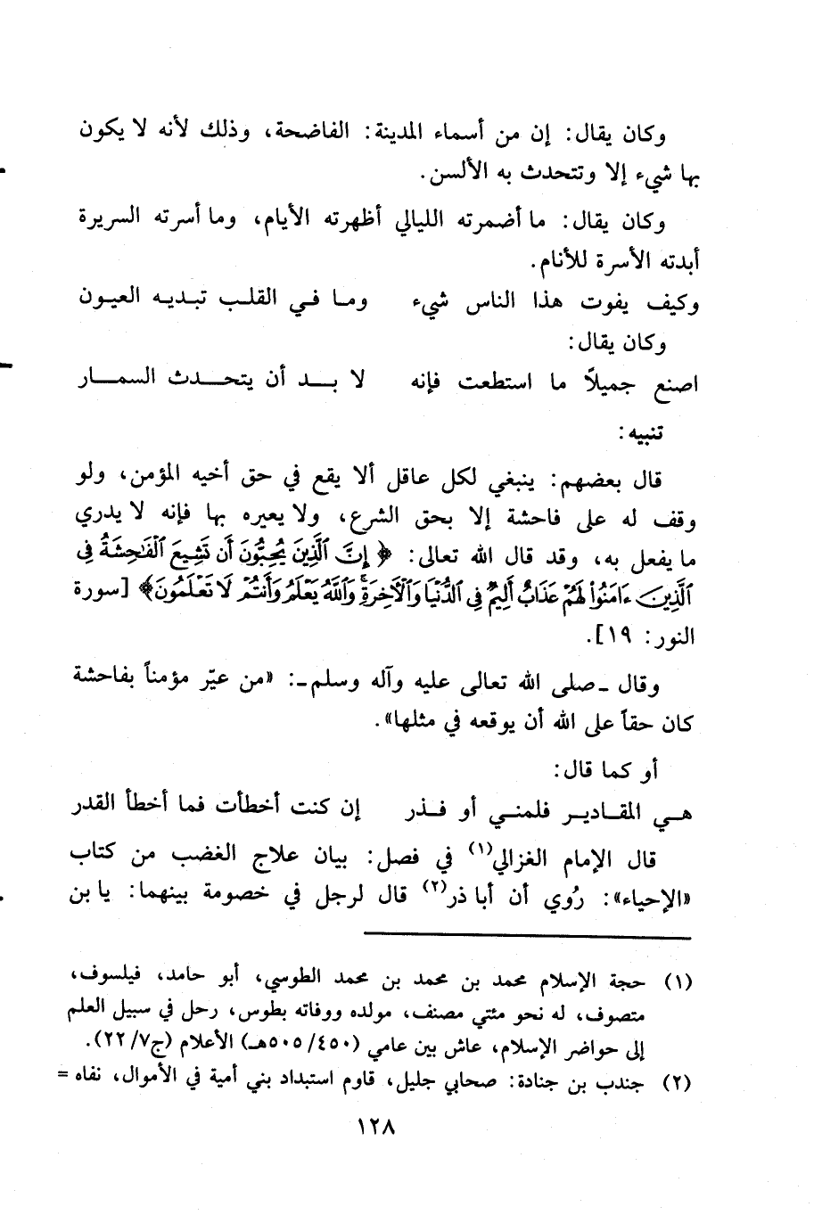 ... فقال له الملك: ألا تتكلم؟ فقال: أيد الله الملك: الماء الساخن يذيب شحم الكلى، ويرخي المعدة، وحب الرشاد يهيج الصفراء، والإهليلج يهيج السوداء ويحركها. قال: فما الذي تقول أنت؟ فقال: الدواء الذي لا داء معه: ألا تأكل حتى تجوع، ولا تشرب حتى تظمأ، فإذا أكلت أو شربت فارفع يدك قبل الشبع واقطع شربك قبل الري، فإنك لا تشكو إلا علة الموت. قال: فصدقه كل منهم فيما ادعاه.