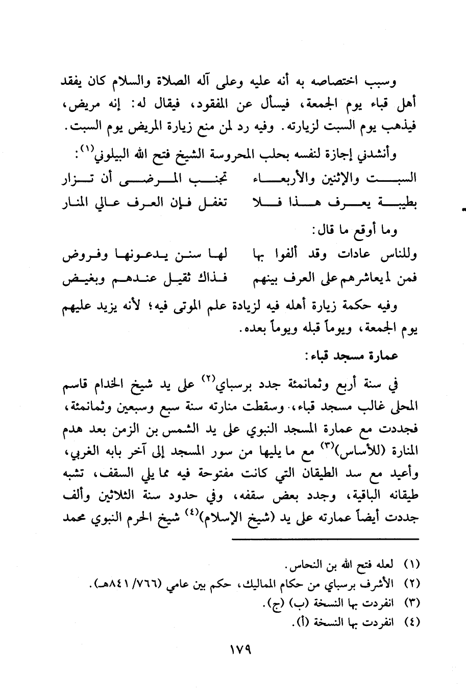 ... وفي الليلة الثانية من وصوله: يقرأ المولد السلطاني في صحن المسجد النبوي بحضرة أمير الركب، فحكام المدينة، وأعيانهم، ويوقد شمع العنبر، ويحرق الند، وعود المجمر، وتفرق أنواع السكر والحلوى على من حضر ذلك المجلس الشريف، والمحفل المنيف.